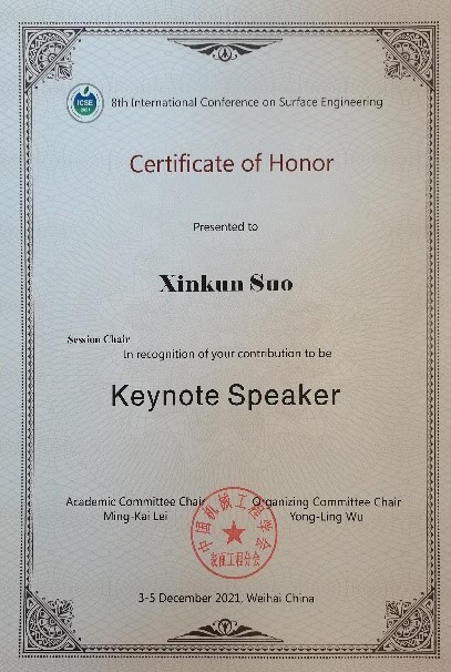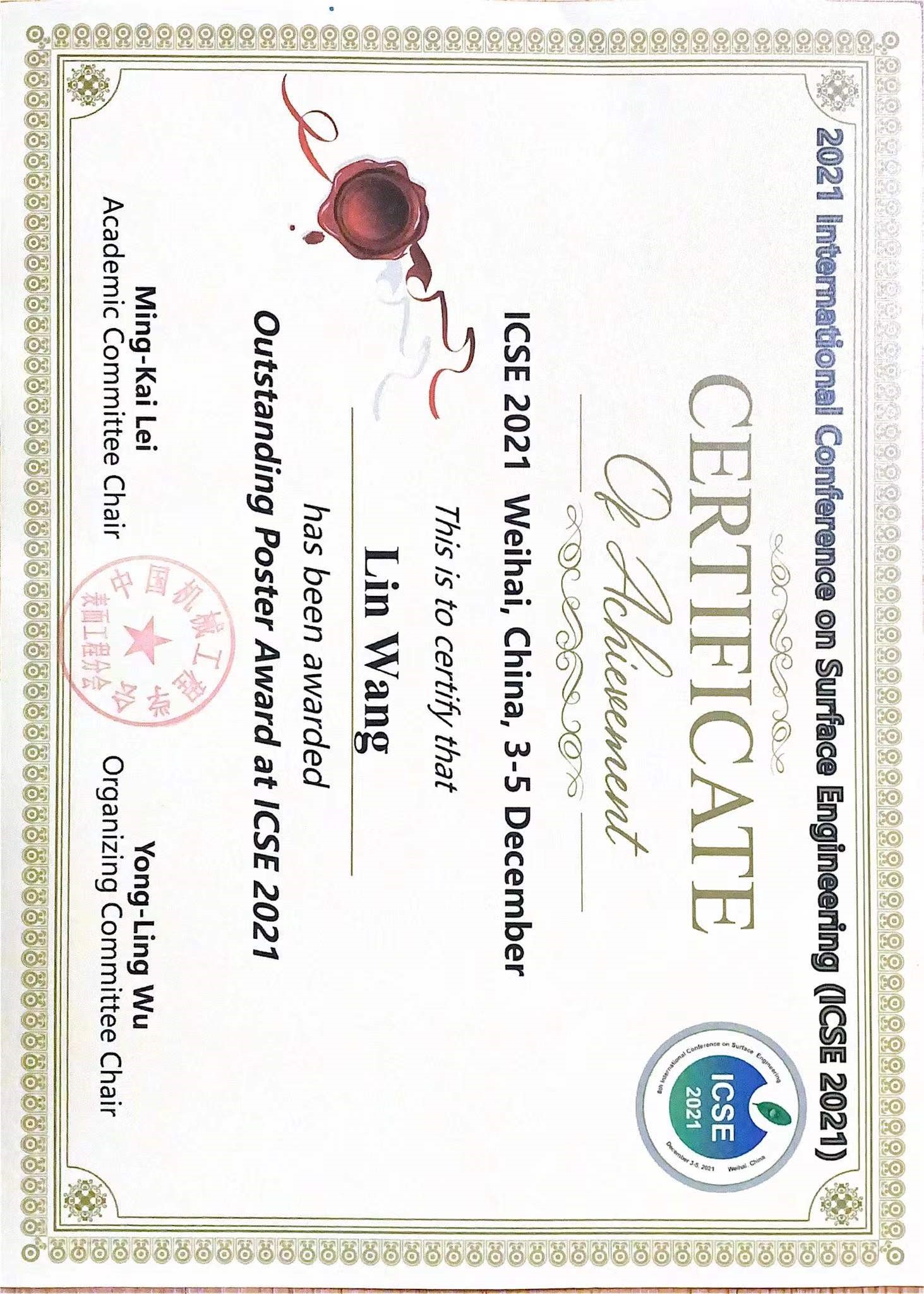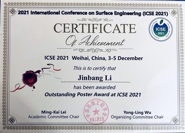 2021年12月3-5日,“2021表面工程国际会议(第八届)”在山东威海隆重召开,我院多维增材制造研究所所新坤教授,曹均博士等一行6人参加会议。其中所新坤教授受邀担任热喷涂分会场主席并受邀做主旨报告,李锦棒博士和二年级硕士生王琳分别获得大会颁发的“杰出海报奖”。