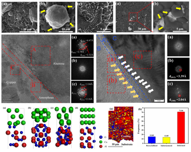 冷喷涂陶瓷金属化是一种新兴的技术。然而,金属颗粒与陶瓷基板的结合机理仍存在争议。所新坤教授研究团队利用铜颗粒和氧化铝基体研究了冷喷涂陶瓷金属化的结合机理。利用扫描电子显微镜(SEM)、透射电子显微镜(TEM)、电子背散射衍射(EBSD)、有限元模拟(FEA)和密度泛函理论(DFT)研究了铜粒子与氧化铝基体之间的界面特性。研究发现,铜颗粒和氧化铝基体的结合过程中存在碰撞熔化和机械结合两种现象,而两种现象的深层次原因都是异质外延结合。不同之处在于,熔化界面发现了非晶和纳米晶,但在机械结合界面只观察到非晶现象。机械结合界面的结合能高于碰撞熔化界面的结合能。同时,研究还发现,铜颗粒的冲击熔化现象不利于铜与氧化铝基体的结合。