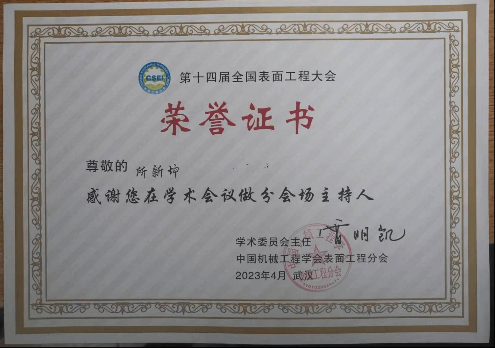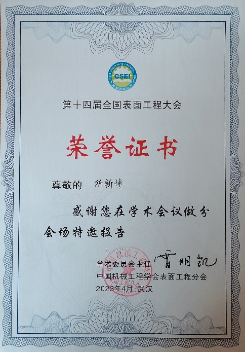 2023年4月22日第十四届全国表面工程大会在武汉拉开序幕,本次大会由中国机械工程学会表面工程分会主办,武汉材料保护研究所有限公司、特种表面保护材料及应用技术国家重点实验室承办,大会主题是“面向绿色低碳高质量经济发展的表面工程技术”。出席本次会议的专家、学者和企业家达1300余人。本次大会场共有2个主旨报告,14个特邀报告。大会下设21个分会场论坛,共计180多个特邀报告和300多个口头报告。成人韩漫 所新坤教授受邀做了题为《激光喷涂颗粒熔化行为研究》特邀报告,并担任热喷涂分会场主席。