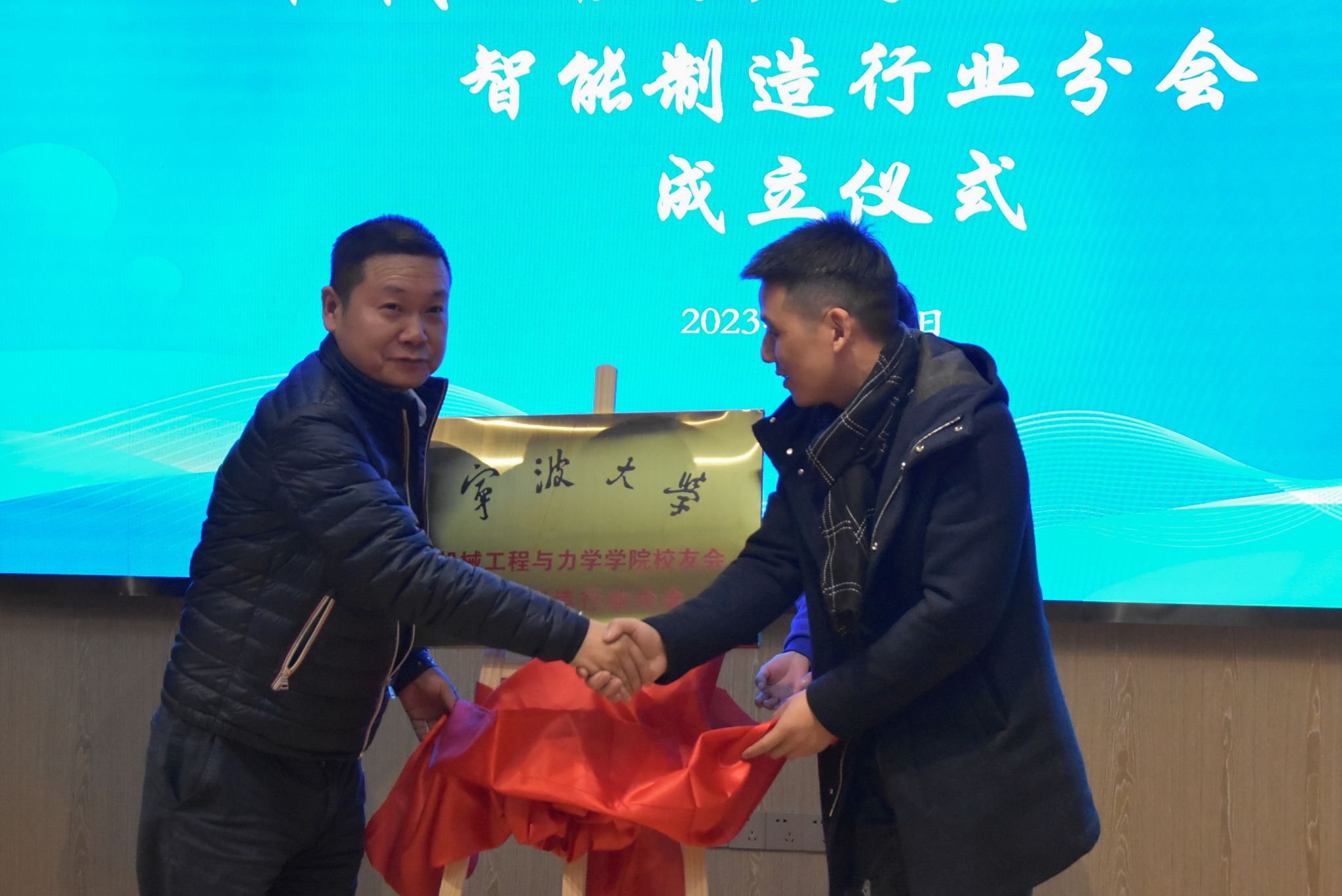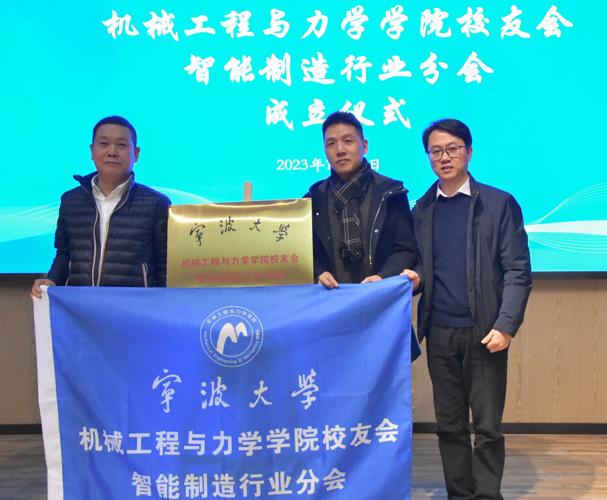 校友会智能制造行业分会成立仪式,分会名誉会长、1988级校友乐晓东,分会执行会长、1998级校友李杰共同上台揭牌,王智腾为分会授予会旗。