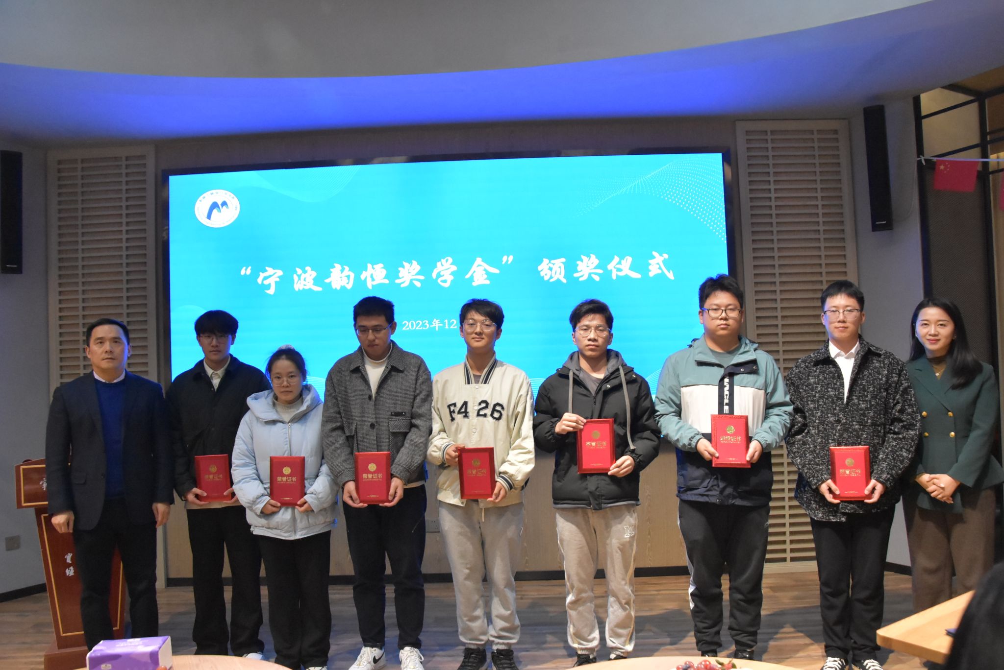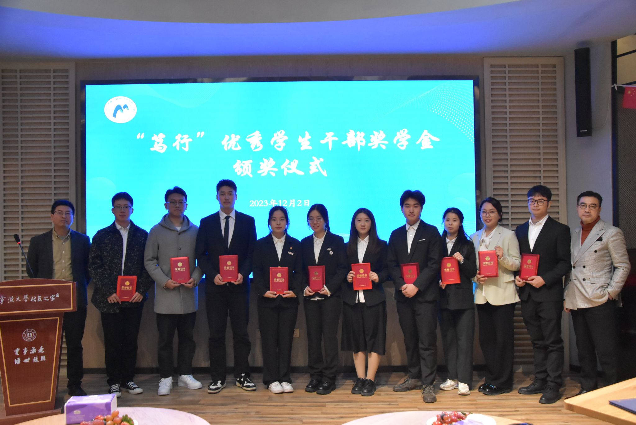 大会还举行了2023年“笃行”优秀学生干部奖学金、2022-2023学年“宁波韵恒奖学金”颁奖仪式。张磊、尹科峰等校友受邀担任“笃行”奖学金评委,并为获奖学生颁奖,“韵恒”奖学金捐赠者谢立栋为获奖学生颁奖。