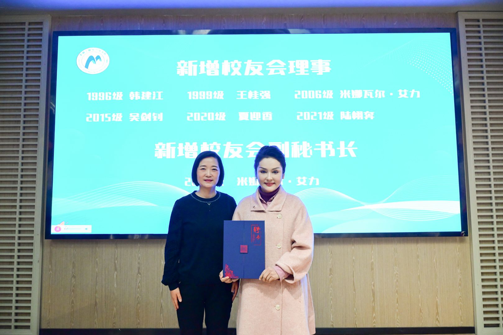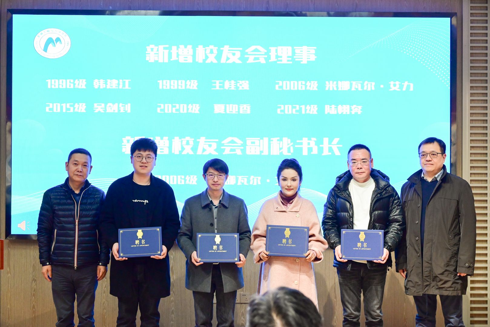 随后,会议审议通过了韩建江等6名校友为新增理事、米娜瓦尔·艾力校友为新增副秘书长名单,校友会常务副会长王竞晖、副会长乐晓东为到场的理事、副秘书长颁发聘书。