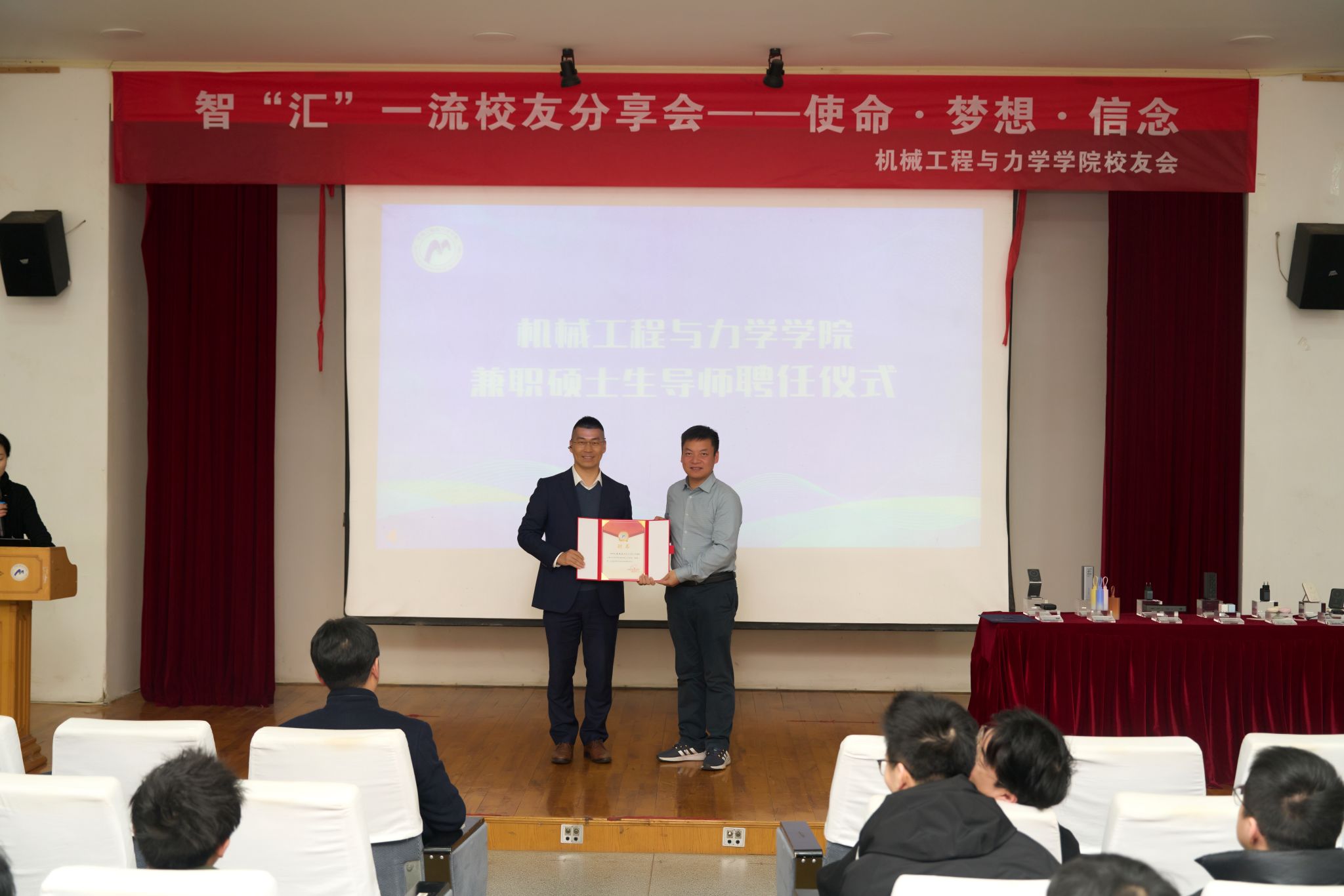分享会在一阵热烈的掌声中拉开帷幕。活动伊始,王智腾书记代表学院向黄颂志师兄颁发了第一份聘书——“浙江省重点支持现代产业学院”兼职导师。王书记指出,这份聘书要寻找的,正是像黄师兄一样“既懂实验室图纸,又懂市场蓝图”的导师,用创业智慧教学生如何将知识转化为价值。随后,彭文飞副院长授予了黄师兄“兼职硕士生导师”聘书,他表示,聘请像黄师兄这样的优秀企业家,能够用实战经验为硕士生的成长提供“脚手架”,让学术研究与企业需求同频共振。两份沉甸甸的聘书,为校企协同育人注入了新的力量。
