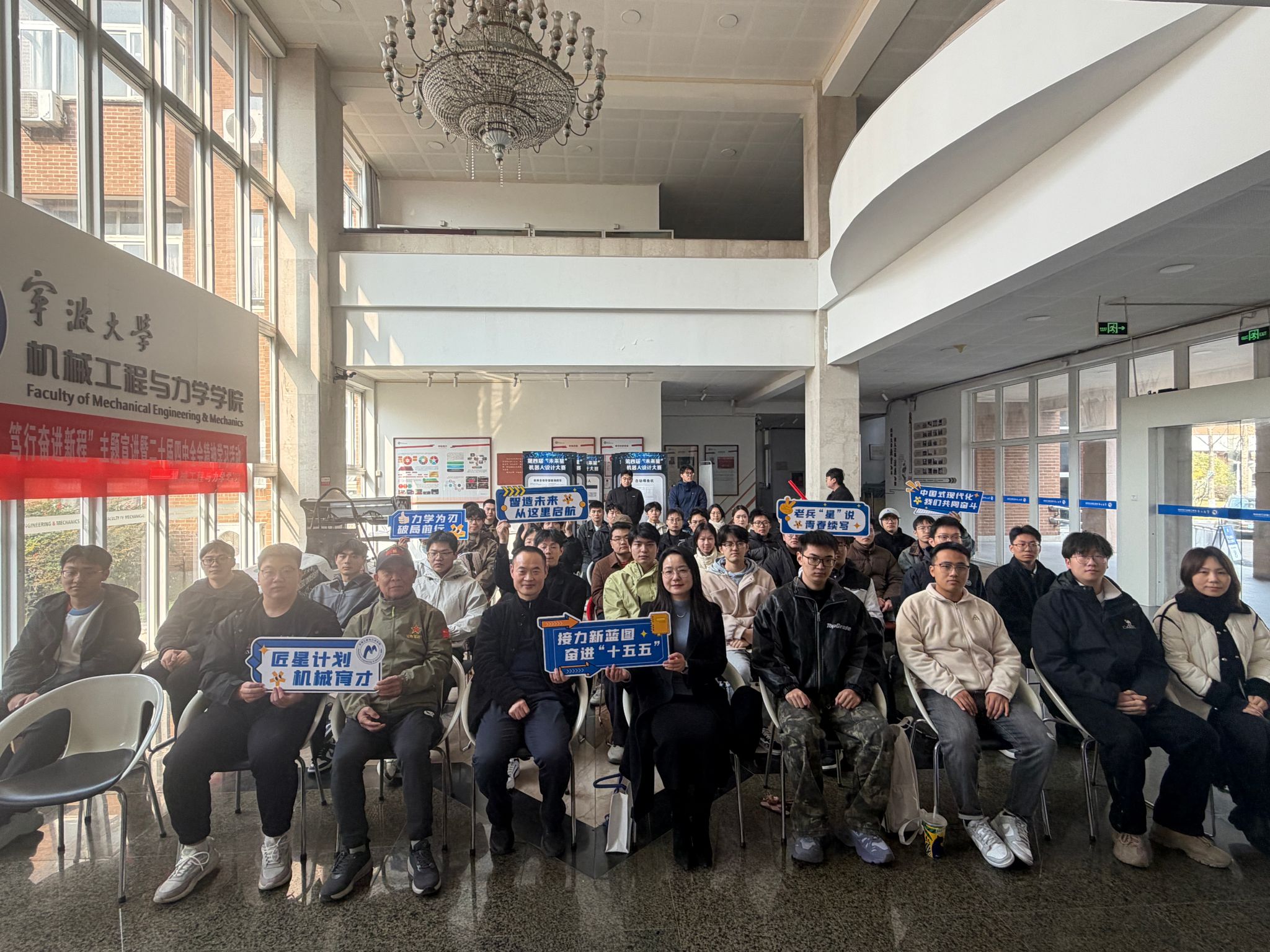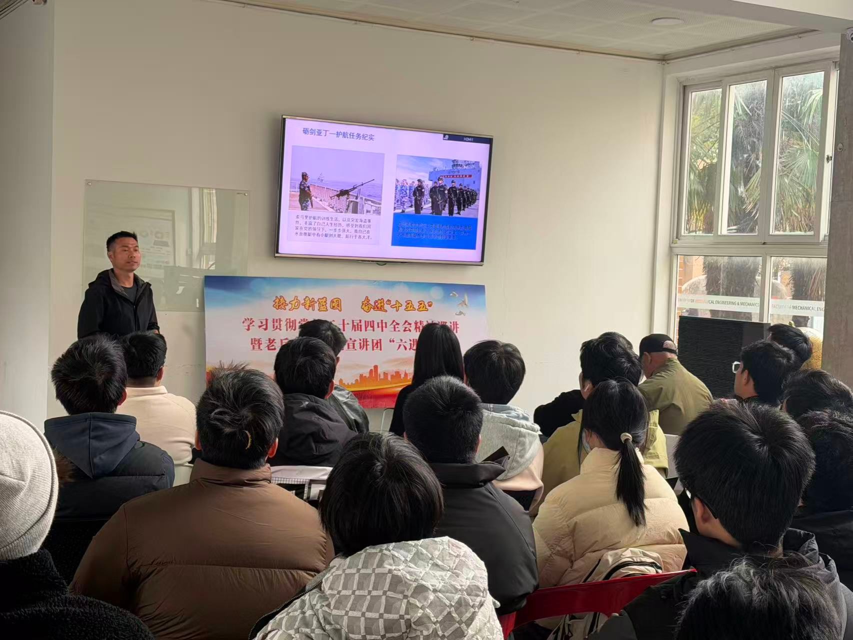 镇海区退役军人事务局局长、老兵“星”说宣讲团负责人于利军局长详细解读了“十五五”规划的宏伟蓝图及党的二十届四中全会精神的核心要义。于局长从“科技自立自强”和“新质生产力”的时代内涵出发,为在场师生描绘了一幅国家未来发展的壮丽画卷,激发了大家投身工科创新、服务国家建设的强烈信念。