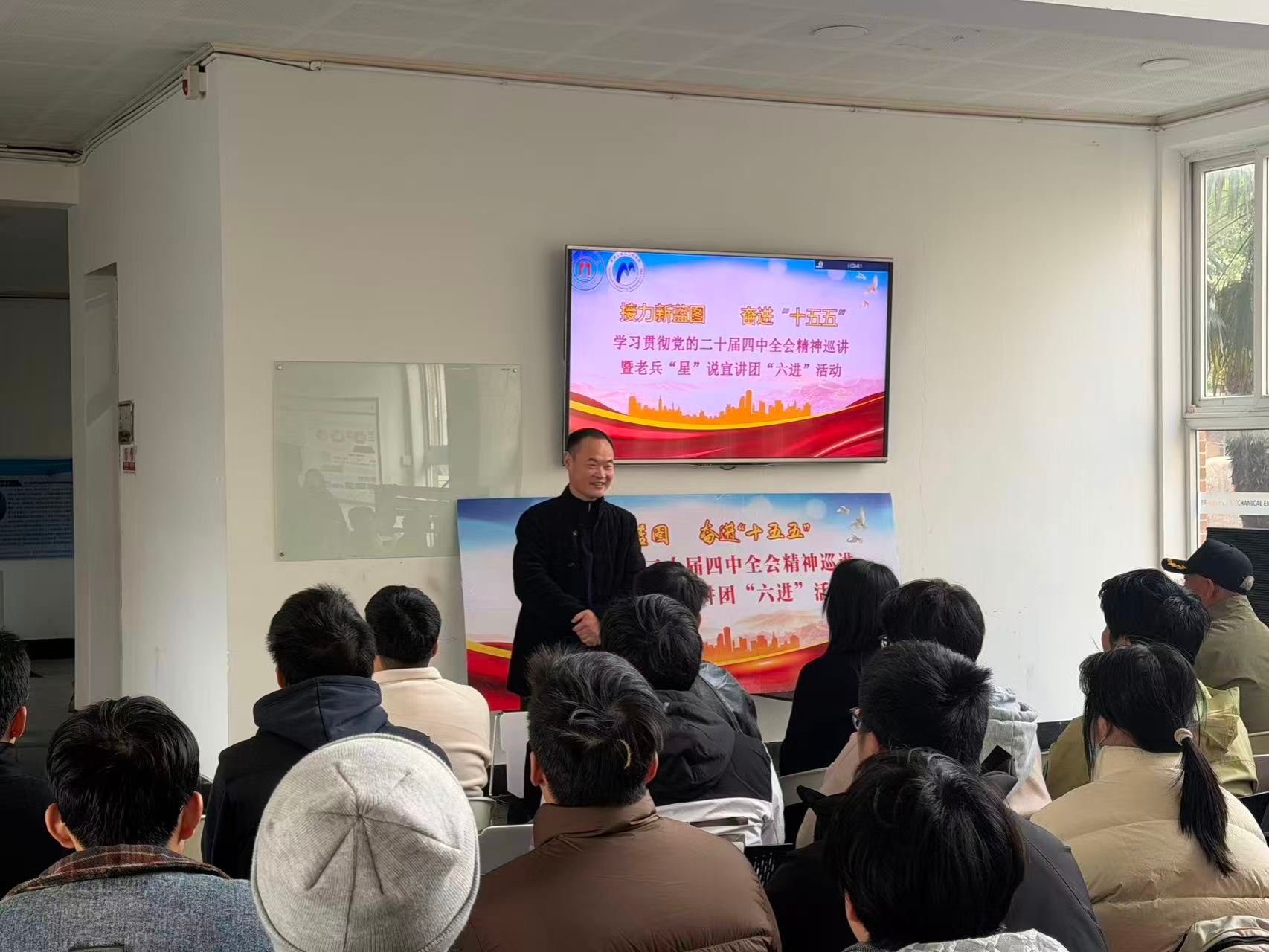 12月3日,学院学生党建中心联合老兵“星”说宣讲团开展“赓续老兵初心,笃行奋进新程”——学习贯彻党的二十届四中全会精神宣讲活动,旨在全面学习贯彻党的二十届四中全会精神,引导青年学子将个人理想融入国家发展大局。镇海区退役军人事务局局长、老兵“星”说宣讲团负责人于利军局长、老兵“星”说宣讲团的各位宣讲员们以及学院学生党支部共50余名人员参与。