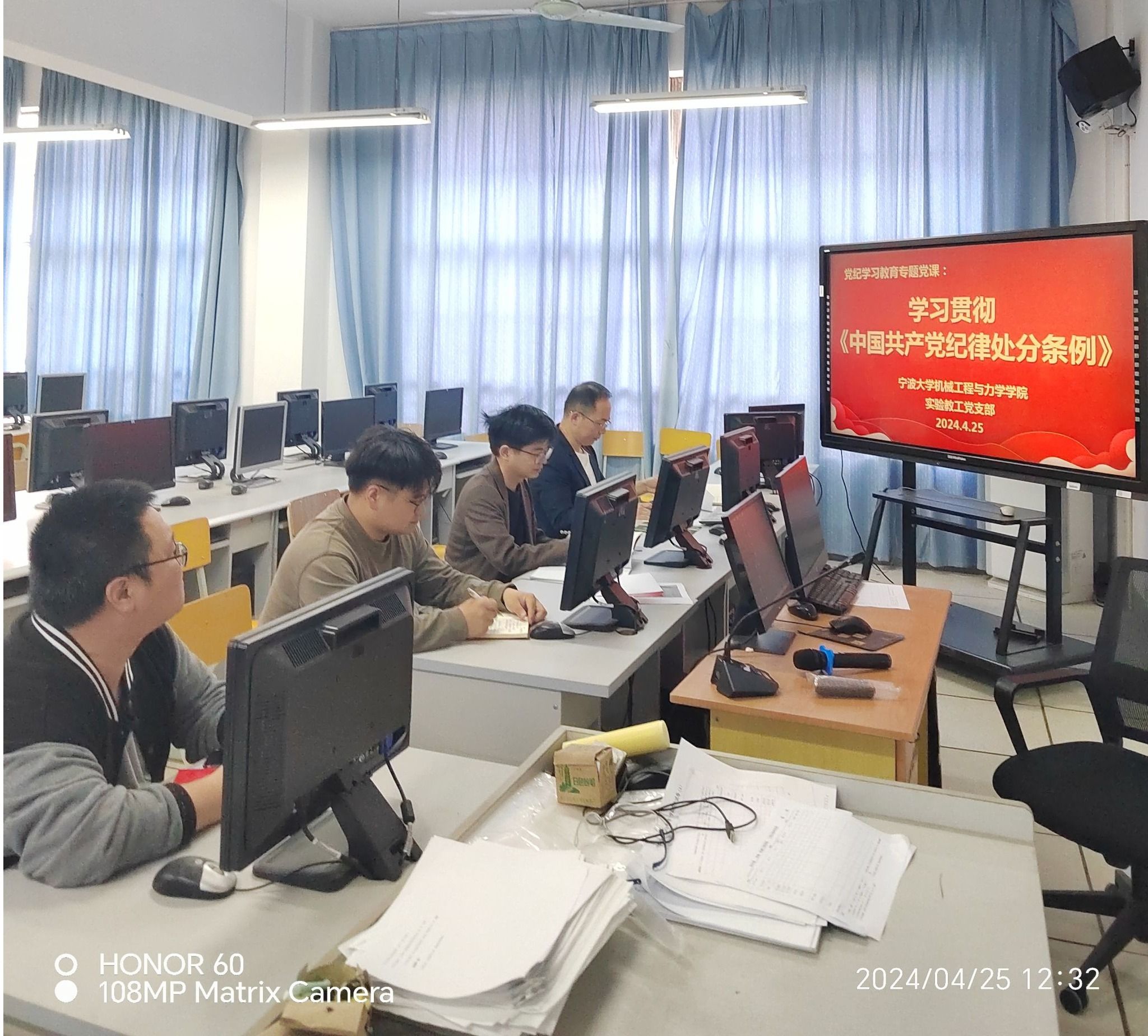 实验教工党支部组织党员在机电工训中心二楼机房召开集中学习会,集体学习《中国共产党纪律处分条例》。