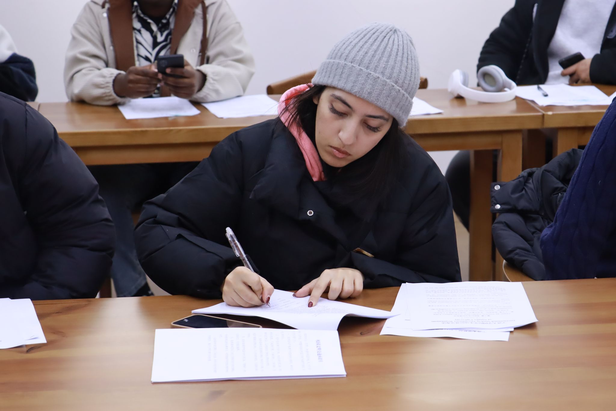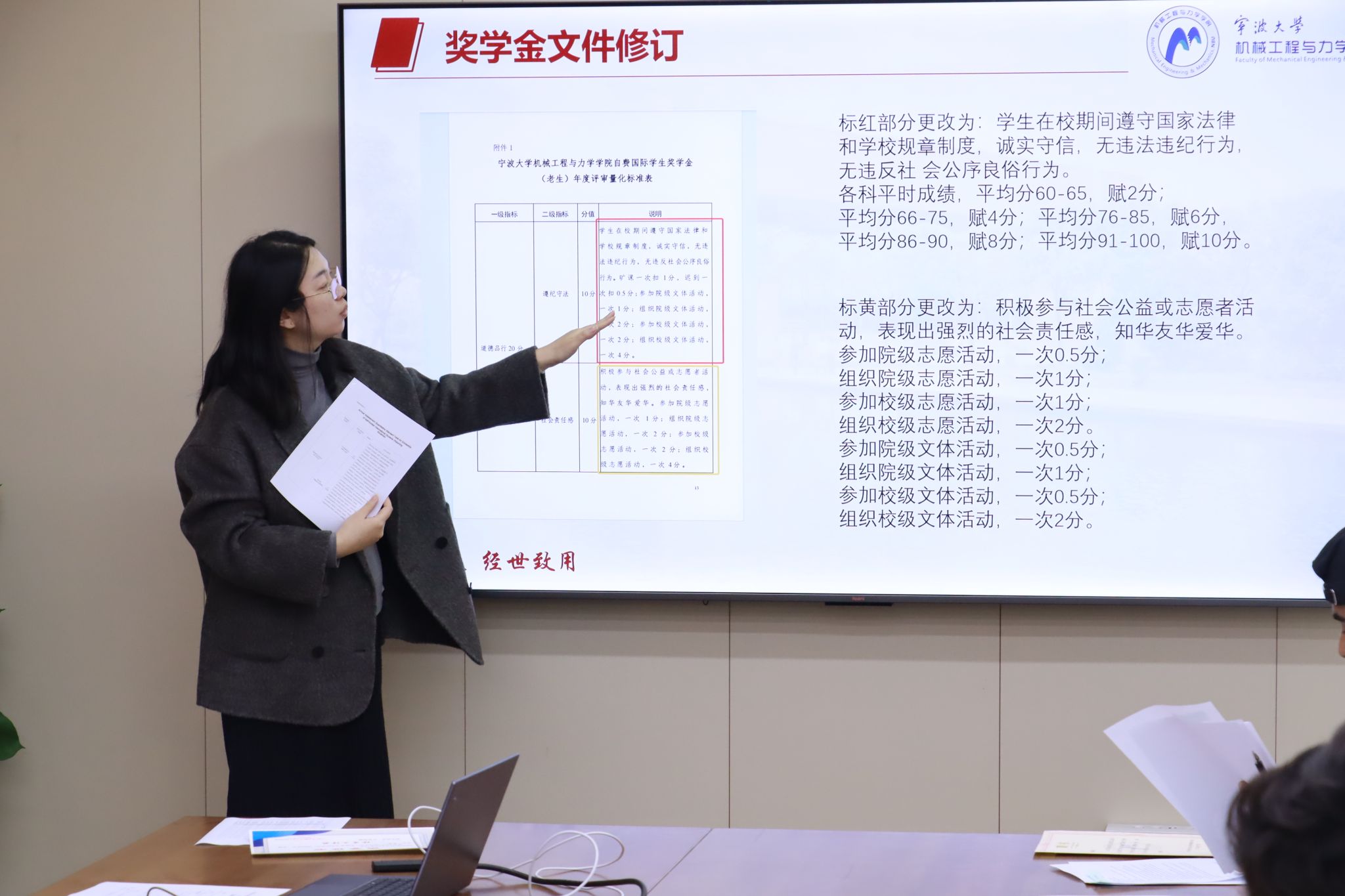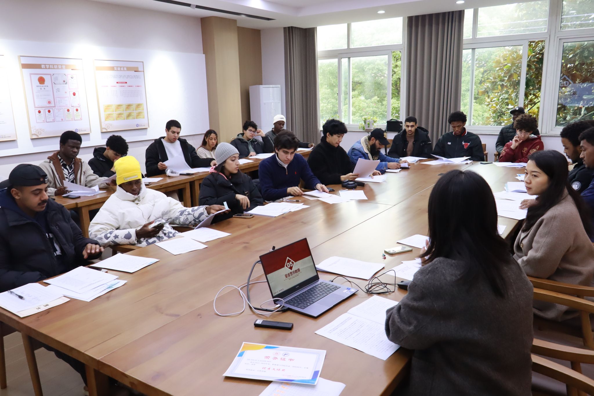 晏程程老师主要从交通、消防、校内外住宿、出行请销假等方面,强调了国际学生近期安全注意事项,并结合了学校相关要求,对期末考试各项具体纪律要求进行了强调,并对各年级期末复习提出了建议。现场也对学院奖学金评定细则进行了修订。