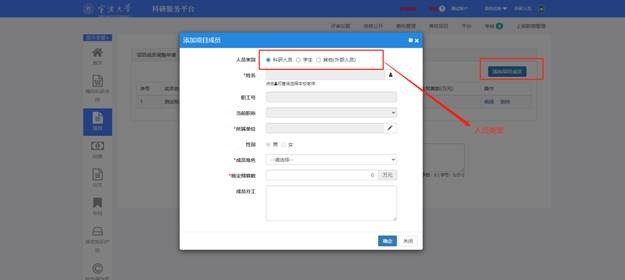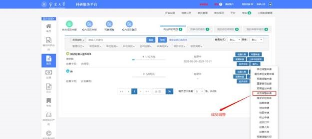 4. 进入项目组成员,请确认成员是否完整。特别是项目中有学生的参与的,请完善学生身份类别。成员信息有问题的,进入科研系统成人韩漫,左侧的项目界面,点击操作下拉框下的成员调整申请,进入成员调整界面进行添加和修改,待项目主管审核之后,会自动补充到项目经费公开一览表,最后再提交即可。