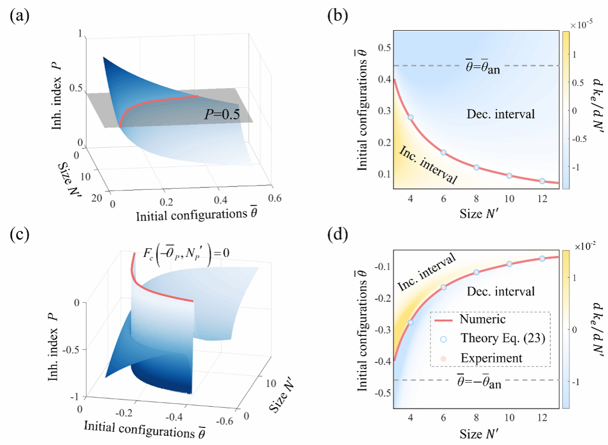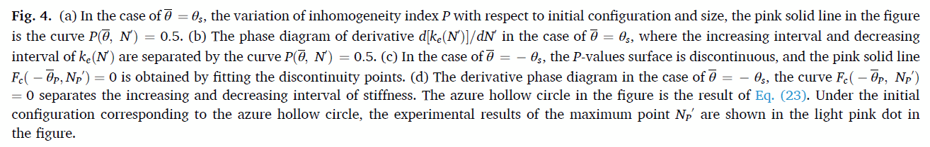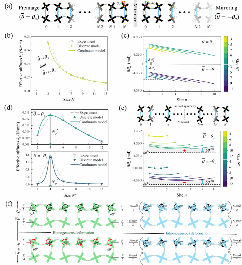 由于低能变形对缺陷或约束、边界条件和非线性的敏感性,目前对低能变形的研究多侧重于利用这些特性获得特定的变形分布,然后通过不同的变形分布获得不同的有效刚度。然而对于力学超材料,结构的尺寸对有效刚度的影响具有不可忽视的影响。对于承载低能变形的单稳态力学超材料,研究人员通过离散模型铺捉到了结构刚度随尺寸增大而增大的反常现象,这种反常行为最终会消失,其衰减长度会收敛到一个与尺寸无关的特征量,然而该类反常行为消失的具体临界点仍无法被准确地描述。