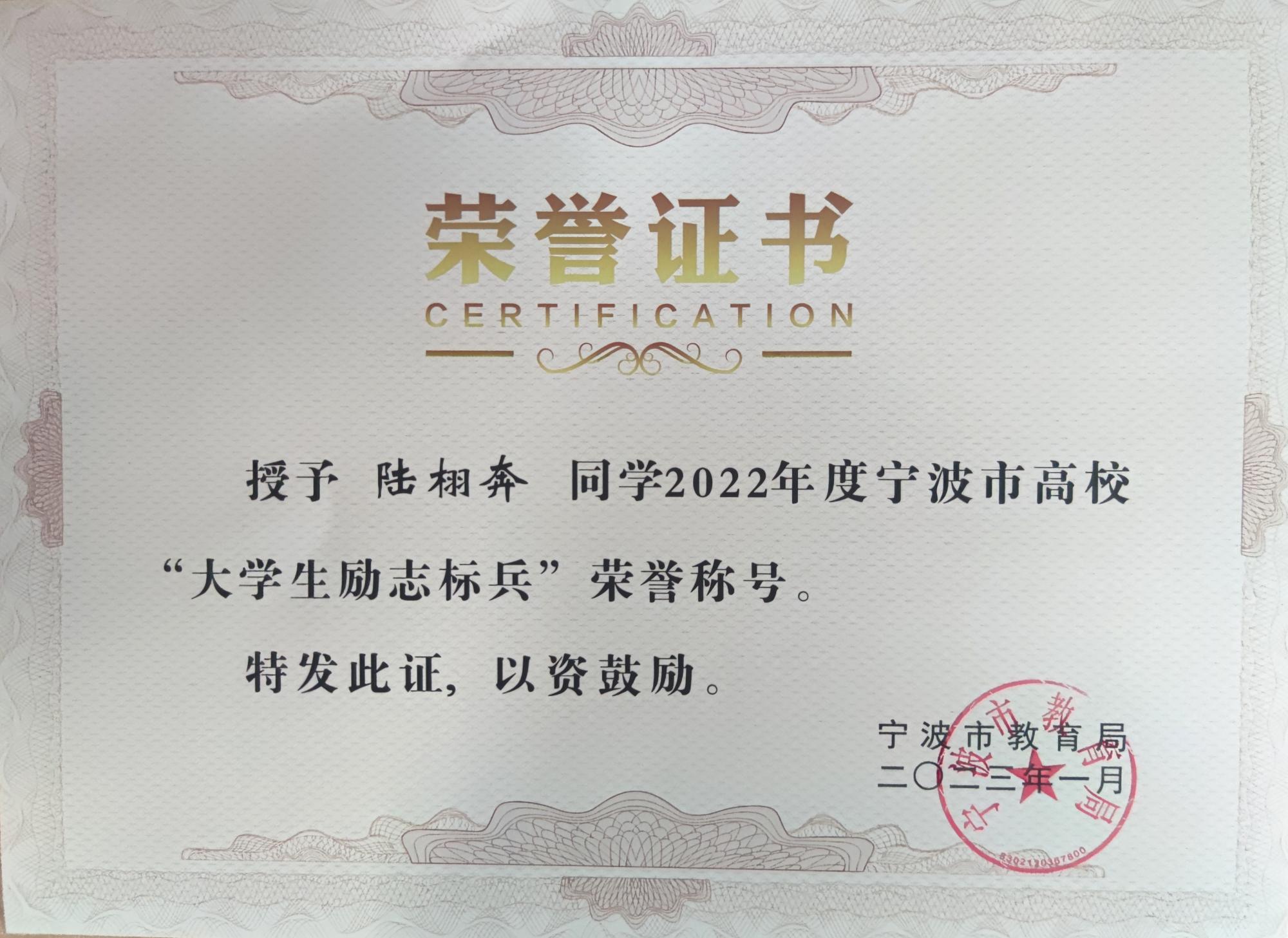 学子获2022年宁波市高校“优秀大学生”和“大学生励志标兵”荣誉称号