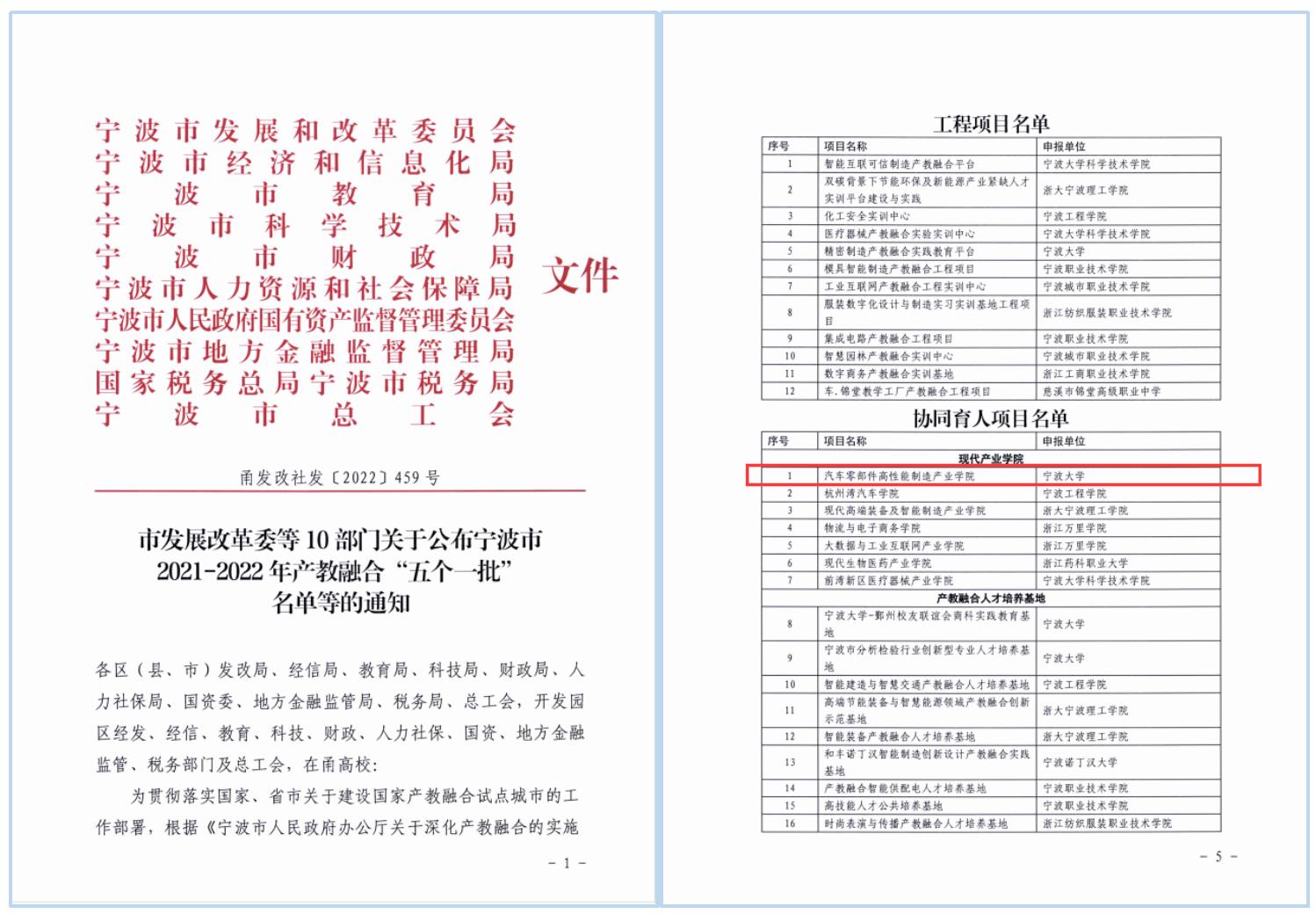 日前,浙江省教育厅、浙江省经济和信息化厅联合下发了《关于公布2022年省级重点支持现代产业学院建设点名单的通知》,我院阮殿波院长领衔申请的“汽车零部件高性能制造产业学院”获批浙江省重点支持现代产业学院建设点,标志着我院在产教融合培养创新型、应用型、复合型人才培养战略中有序扎实推进,向着建设高水平现代产业学院的目标稳步迈进。