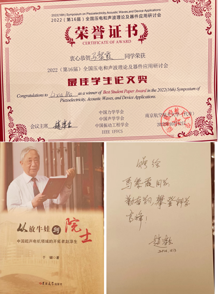 力学系压电实验室的多名老师和学生就自己在压电和声波技术相关的最新工作进展,全文投稿参加了本次会议,并进行了报告。其中工程力学拔尖人才创新班本科生马黎霞同学获大会“最佳学生论文奖”(全国仅6个),是唯一获奖的本科生,并在会后获赵淳生院士赠书。此外,6位获奖学生中的四川大学硕士生楼旭辉同学,为成人韩漫