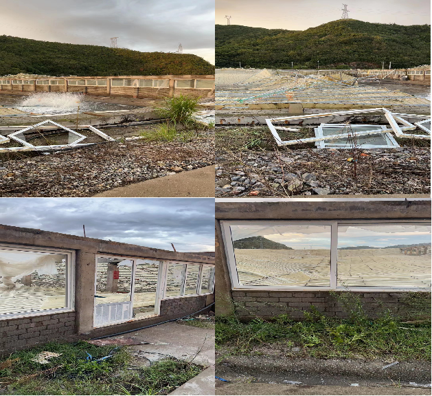 流体力学与流变学研究所第一时间组织所内科研人员奔赴台州市三门县、象山县、舟山市普陀区等地一线调研水产养殖大棚受台风影响情况。研究所博士后任志明根据工作安排,迅速前往周边养殖企业进行受灾调研工作。调研结果显示,台州三门、宁波象山、鄞州等台风10级风圈影响范围内的养殖大棚并未受到严重影响,结构基本完整,仅部分墙体开裂和钢结构轻微变形。舟山市普陀区、登步岛等地在台风12级风圈影响范围内的养殖大棚受到较严重的影响,部分企业的养殖大棚大面积倒塌,损失惨重。针对受损情况,研究所迅速进行数据采集、计算分析,进一步优化抗台结构设计方案,为养殖企业恢复生产提供技术支持和保障。