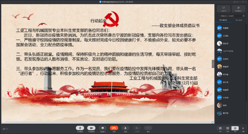 12月13日是第八个南京大屠杀死难者国家公祭日。为沉痛悼念在南京大屠杀中死难的同胞,警醒党员同志勿忘国耻、自强不息,12月13日下午,工业工程与机械国贸专业本科生党支部开展了以“铭记历史,把握当下,齐心战疫”为主题的线上党日活动,活动由支部副书记洪辰主持。
