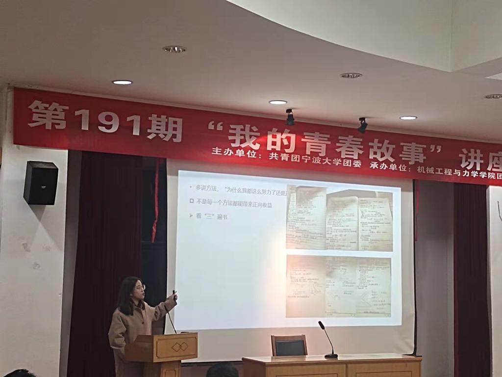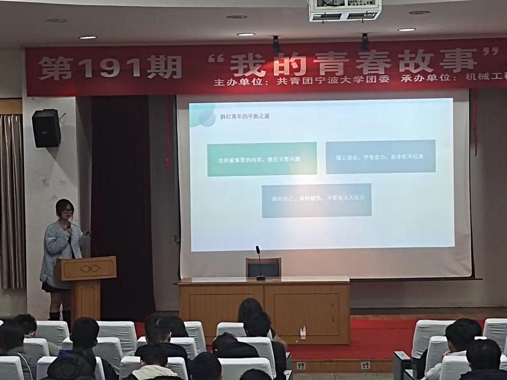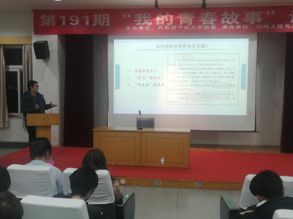 分团委承办的第191期“我的青春故事”报告会在此举行。报告会挑选了我院3位成功保研的优秀青年学子典范,通过个人VCR展示、PPT演讲、成果展示等形式,将他们的奋斗故事和心路历程分享给在场观众,让在场同学受益颇深。