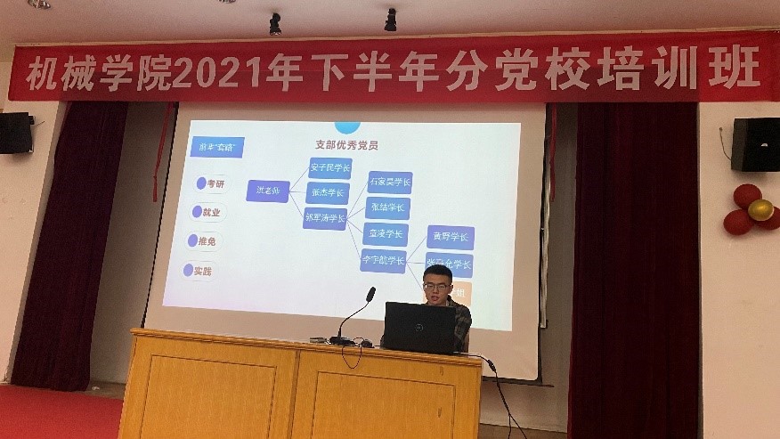 接着,来自2018级的吴兆波主要向同学们讲解了他的入党历程和成为党员后给自己带来的改变。他从自己在入党过程中的一篇《陌上石榴花开》展开,结合自己在疫情防控期间的志愿服务工作,跟大家分享了他的座右铭:锤子敲打的力量+镰刀收割的希望=旗帜飘扬的辉煌。分享过程中,吴兆波同学也希望大家能平衡好生活和学业,学习身边榜样,争做模范先锋,传播正能量,成为于党于国于家奋发有为的新青年。