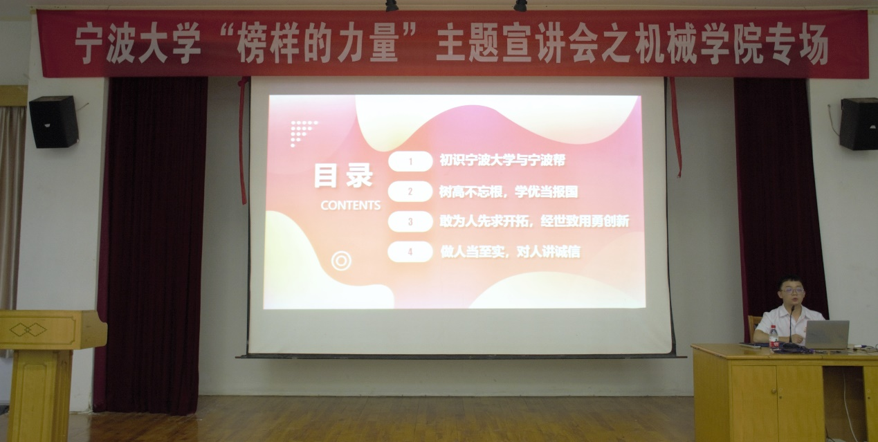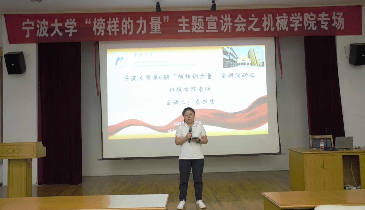 的学子,在宁波帮精神的熏陶下成长,我们要学习宁波帮人士的开拓进取、知行合一、爱国爱民,更要将宁波帮精神融入自己的人生发展中,将精神一代代传承下去。最后,他用三句话与在座同学共勉:树高不忘根,学优当报国;敢为人先求开拓,经世致用勇创新;做人当至实,对人讲诚信。精彩、鲜活、催人奋进的青春励志故事传递了满满的正能量,赢得了现场同学的阵阵掌声。讲座结束后,193工程力学本科生赵思宇同学说:“榜样的力量直击人心,通过这次活动,我真切感受到了优秀榜样的行动力。”