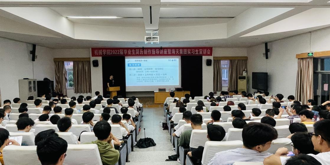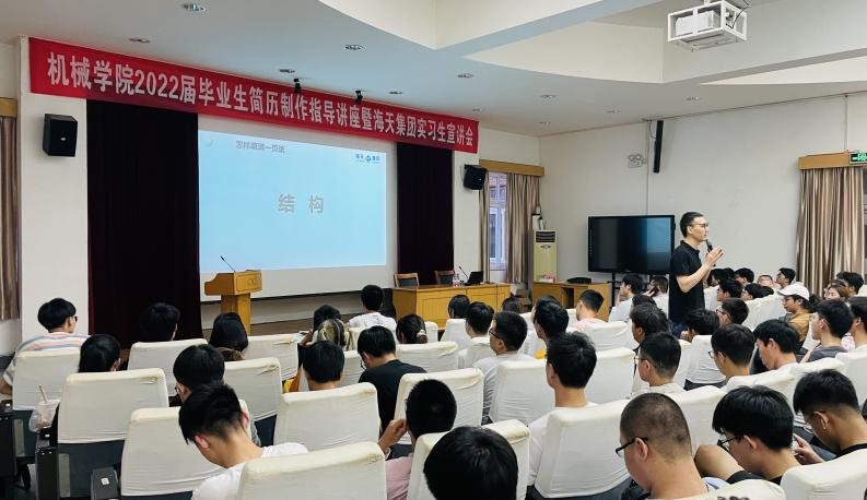 为充分调动2022届毕业生暑期生产实习积极性,帮助大家掌握简历制作的技巧,5月11日晚,我院于绣山工程楼三楼报告厅举行2022届毕业生简历制作指导讲座暨海天集团实习生宣讲会,2022届毕业生近180余人参加。