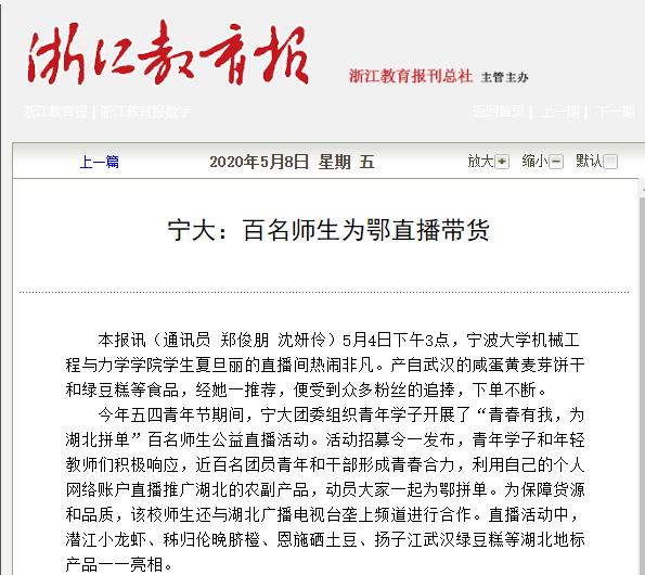 洪松、夏旦丽等4名师生还积极参与,“青春有我,为湖北拼单”百名宁大师生公益直播活动,事迹受到学习强国、《浙江教育报》、浙江新闻客户端、宁波日报、钱江晚报、宁波晚报、中国宁波网、凤凰网、宁波市人民政府等多家主流媒体和政府部门报道关注。