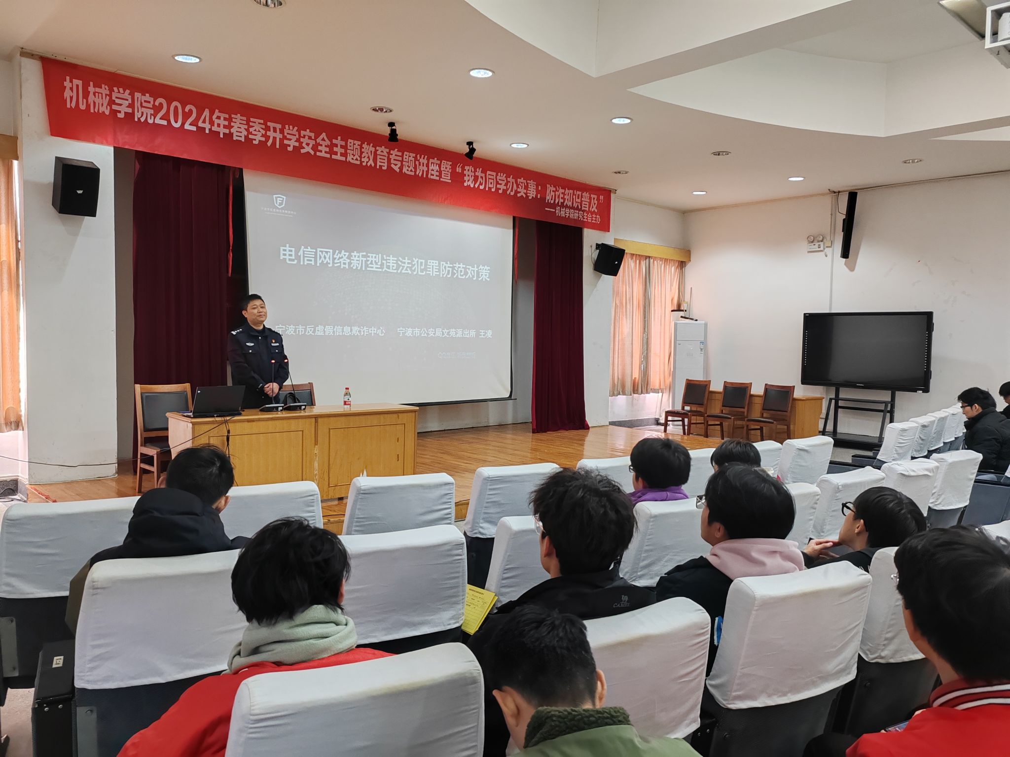 在绣山工程楼三楼报告厅举行2024年春季开学安全主题教育专题讲座暨“我为同学办实事:防诈知识普及”活动。来自全院本研各班级的150名学生代表现场聆听。