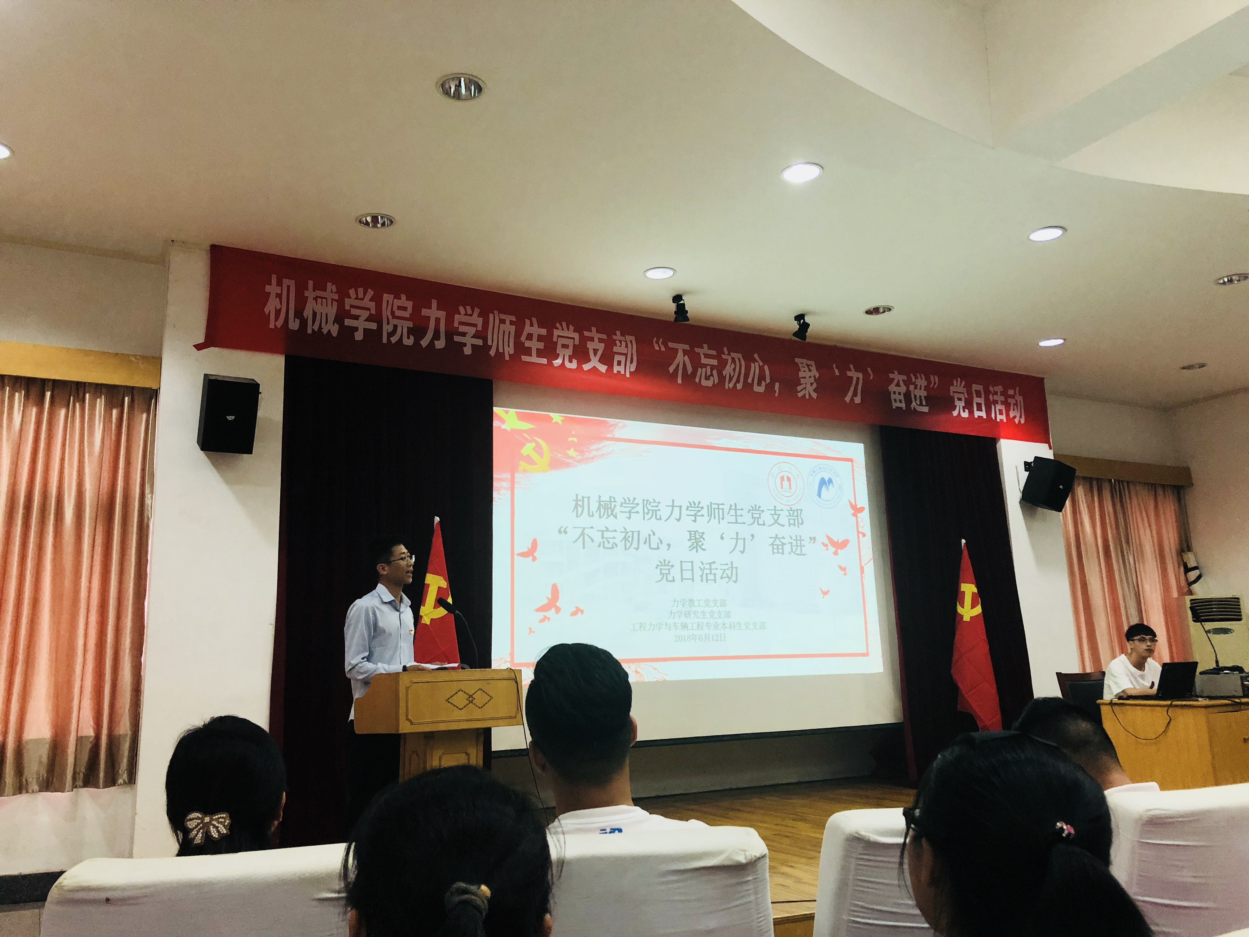 6月12日下午,力学教工党支部、力学专业研究生党支部和工程力学与车辆工程专业本科生党支部在三楼报告厅举行了以“不忘初心,聚‘力’奋进”为主题的党日活动。学院党委委员、力学专业师生党员、其他14个师生党支部支委和学生党建中心委员等参加了本次活动,同时学校评审团和医学院观摩团也全程进行了观摩。活动由力学教工党支部书记张明华教授主持。