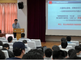 兰浩学长围绕“如何制作一份简历”和“职业生涯规划”两个部分先后论述。首先阐明了简历在求职过程中的重要性,简历不仅是求职路上的“敲门砖”,更是面试官的“第一印象”。接着,兰学长从HR的角度,提出简历制作应把握“阅读体验”和“内容为主”两个关键点,并围绕这两个关键点对简历各部分的制作要点进行了详细的讲解,强调简历的简洁性和条理性,结合自身实际情况,避免假大空的用词。
