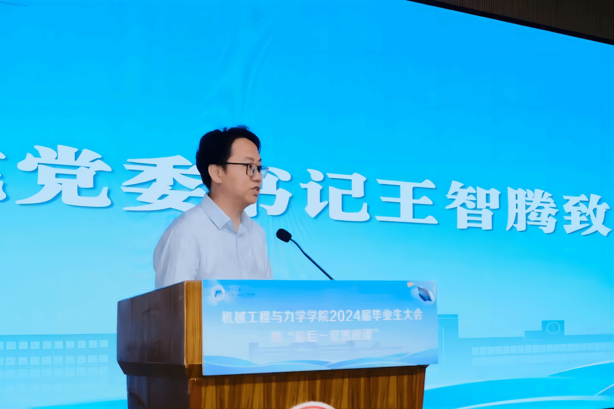大会伊始,学院党委书记王智腾发表致辞。他首先向毕业生们表示了最热烈的祝贺,并深情回顾了他们在学院的学习和生活。他充分肯定了毕业生们在学术探索、科技创新、社会实践等方面取得的优异成绩,并对他们即将踏上的新征程寄予厚望。他鼓励毕业生们在未来的工作中做到心有所向,与祖国时代同频共振;做到心有所爱,对事业生活保持真诚与挚爱;做到心中有光,保持向上奋进攀登的坚毅姿态;以创新和实干书写人生新篇章。书记的话语如同启程的号角,激励着每一位毕业生勇往直前。