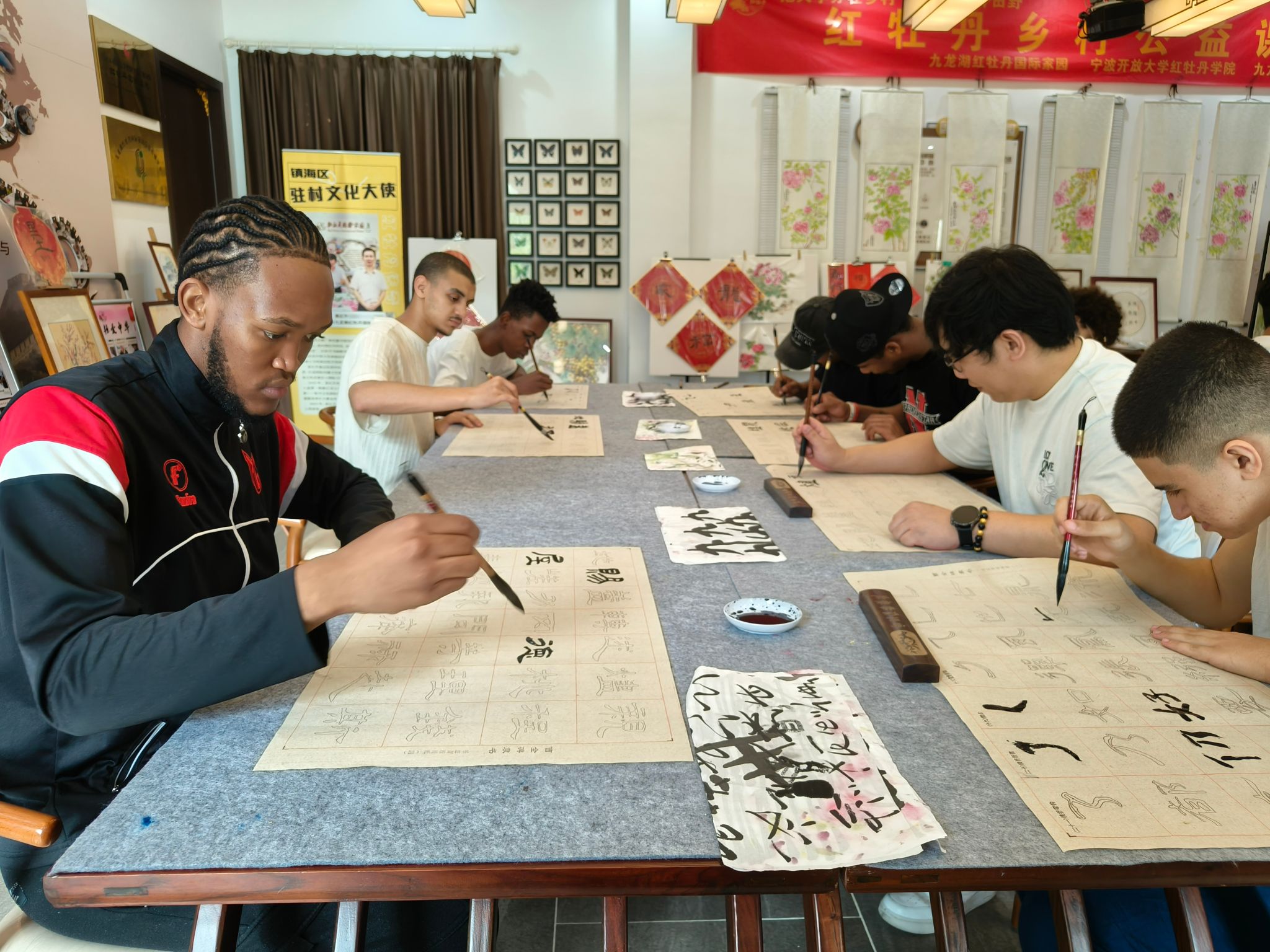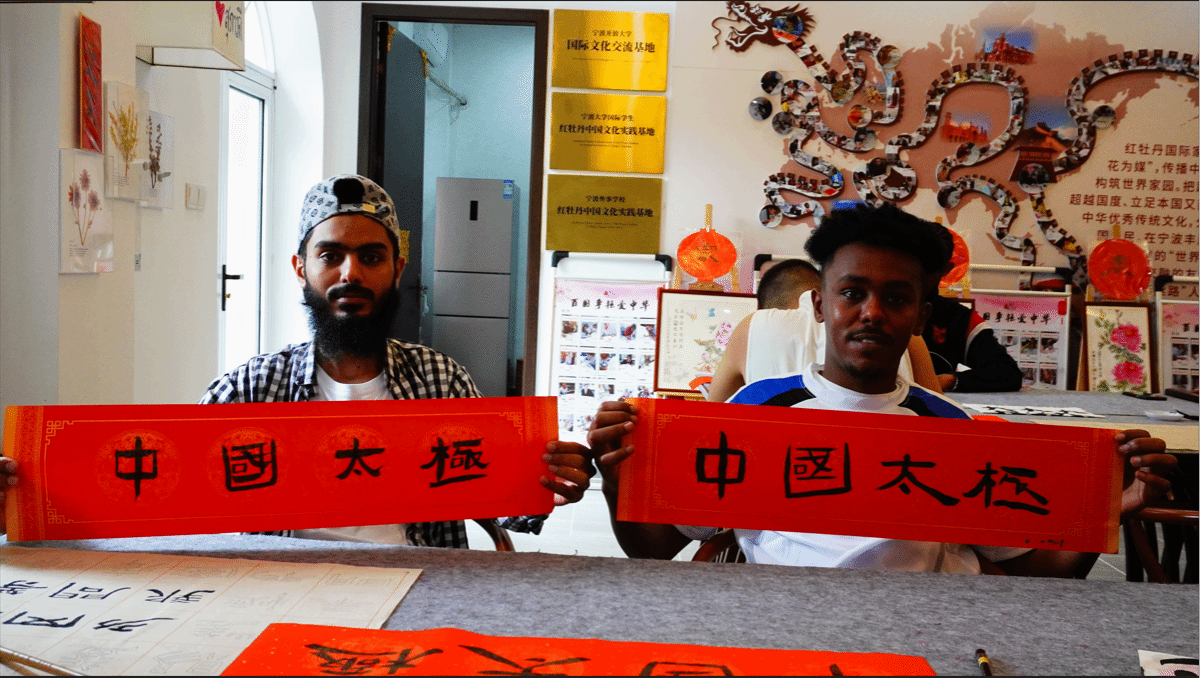 本次活动邀请了宁波红牡丹书画国际交流社创始人、宁波开放大学红牡丹学院院长姜红升作为主讲人。用英语授课,手把手演示......在书写示范过程中,姜老师声情并茂,将太极动作融入书法中,一笔一划好似在演练太极,引得大家纷纷叫好,“Nice!”不绝于耳。在之后的书法体验中,每一位学生都沉浸其中,使出“浑身解数”,笔走龙蛇,体会汉字的结构之美。“中国太极”“含胸拔背”“气沉丹田”几个字叫姜老师也不禁拍手称赞。令大家惊喜的,还有“Chinese Kung Fu”。同学们纷纷站定,跟着姜老师的引导开始演练太极,舒展身心,完全放松下来,在一招一式中感受中国武术的独特魅力。