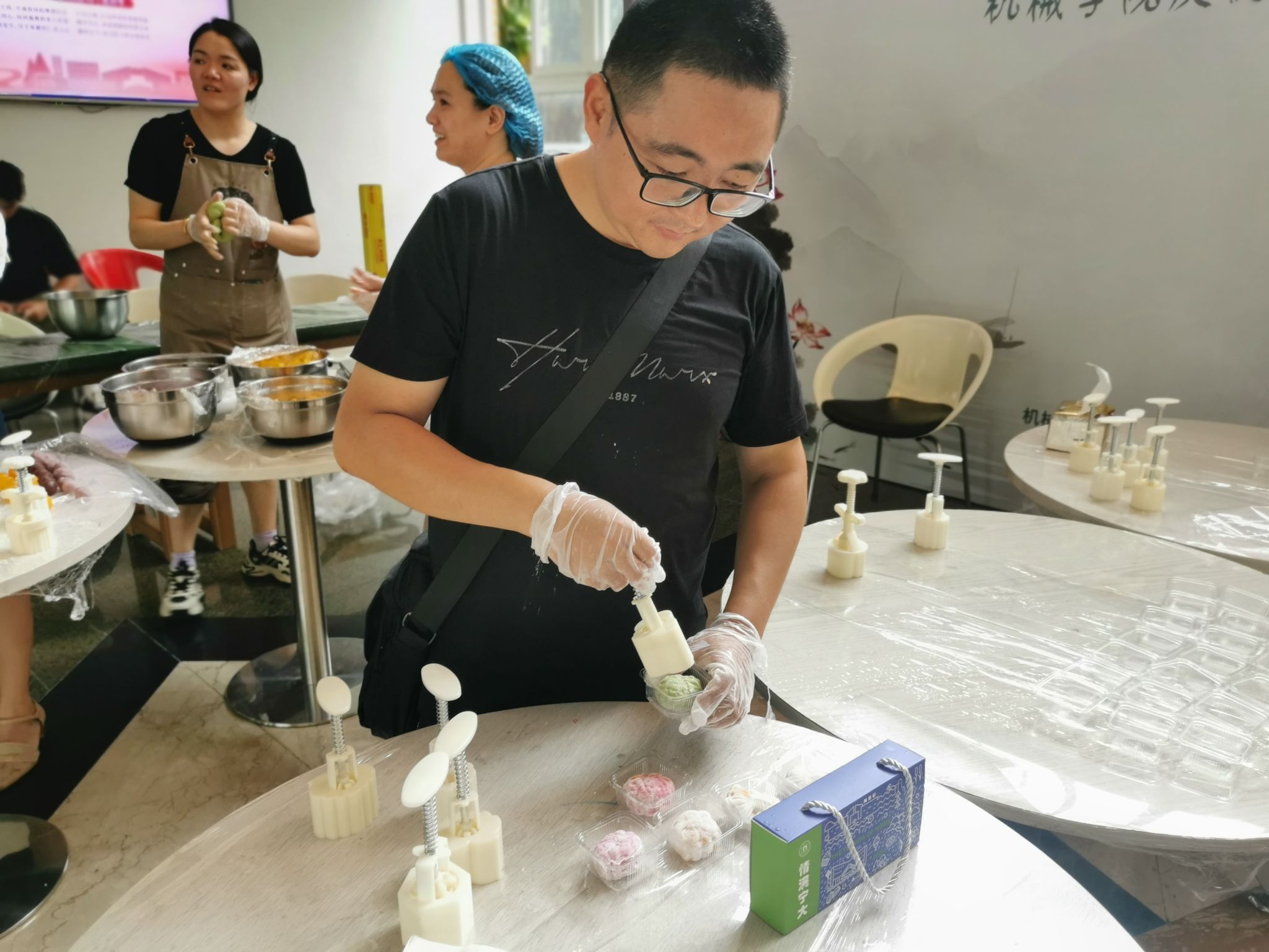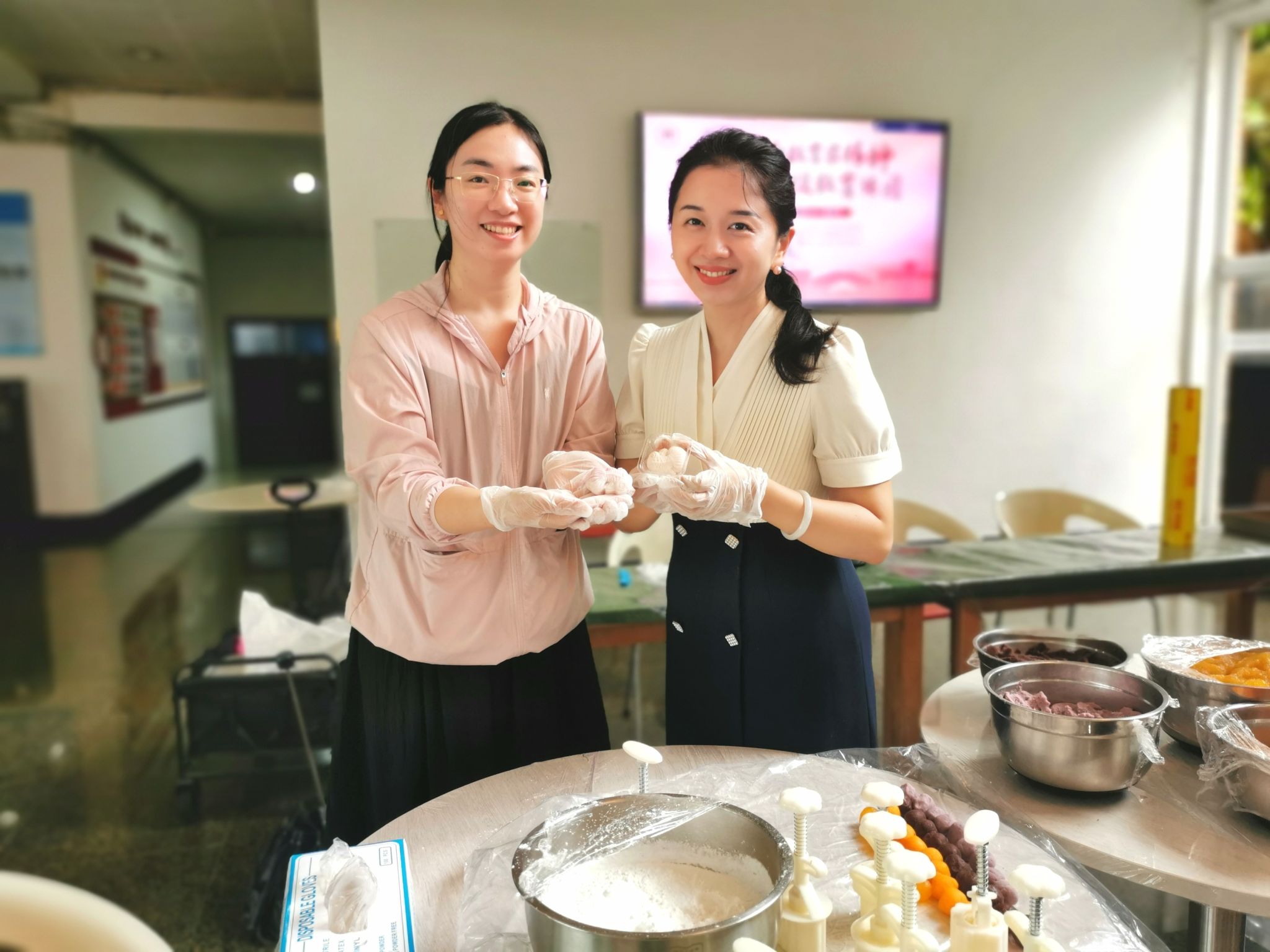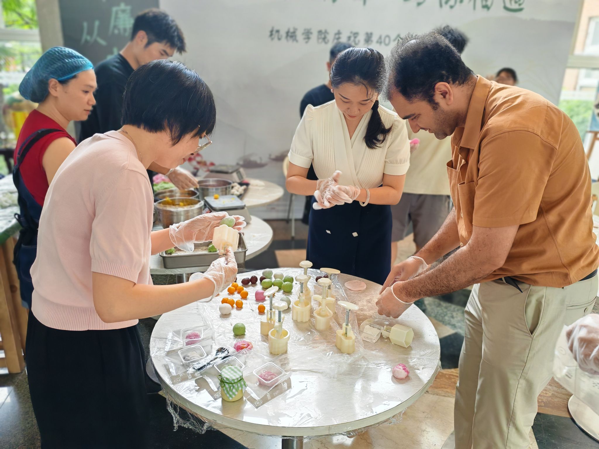 临近中秋,现场还有手工制作月饼的环节,在专业糕点师的指导下,老师同学们戴上手套,纷纷上手制作荷花状的冰皮月饼,压皮、包馅、收口、印模……师生们互相交流感悟,积极分享造型与脱模的小技巧,不一会儿,一块块精致小巧的月饼就在手中诞生,师生们一同分享节日的快乐。