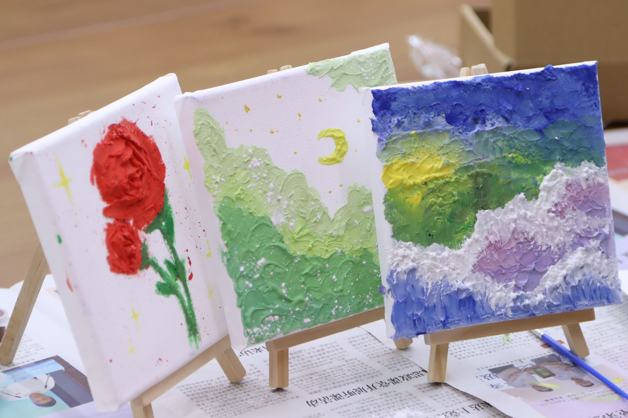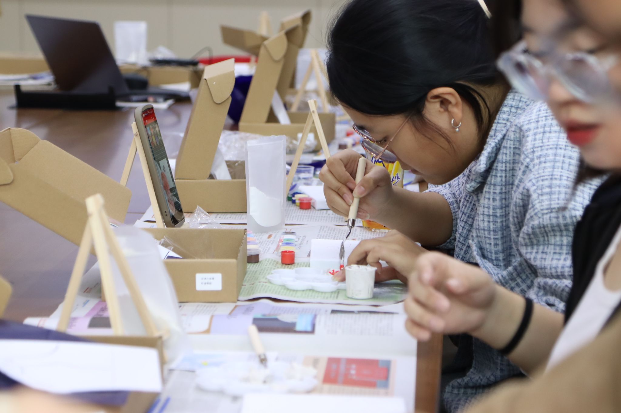 在接下来的一个小时里,同学们纷纷拿起画笔,沉浸在创作的世界中。他们或独自沉思,或三两成群讨论,将内心的情感与思绪转化为一幅幅独特的肌理画作。教室里弥漫着颜料特有的香气,伴随着轻柔的背景音乐,整个空间仿佛变成了一个心灵的避风港。