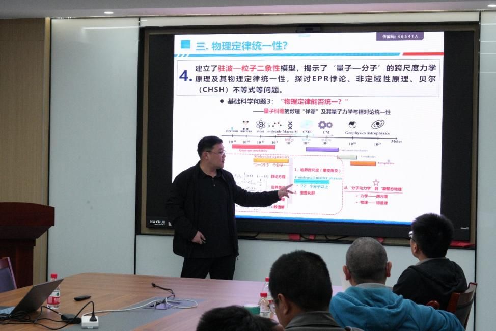11月8日下午,国家杰出青年科学基金获得者,特种环境复合材料技术国家级重点实验室副主任,哈尔滨工业大学教授吕海宝应邀做客成人韩漫 极端环境交叉力学研究中心,于龙赛理科楼南楼519会议室为成人韩漫 师生带来题为“物理定律统一性”的精彩报告。该报告会由林骥特聘研究员主持,学院相关专业师生参与交流学习。报告会上,吕海宝教授就“玻璃态物质本质是什么?”和“物理定律能否统一”这两个前沿科学问题展开探讨。吕教授首先针对“玻璃态物质本质”问题,揭示了其“有序-无序”转变机制,并建立了非连续离散型分子运动的自由能平衡方程,深入分析了化学键约束与物理作用约束的尺度效应。此外,他还发现了分子协同运动的“分子纠缠”规律,并基于最大熵变原理建立了统计模型,验证了重整化群论的“域值=e+1”,成功攻克了这一难题。接着,吕教授探讨了“物理定律统一性”问题,建立了分子-凝聚态的多尺度力学及其跨尺度效应模型,揭示了跨尺度效应的幂律与自治规律,发现了标度律与分形维度之间的内禀关系,并确定了凝聚态尺度常数。这些研究成果有力地证明了分子物理与凝聚态物理的物理定律统一性,为凝聚态物理学领域开辟了新的研究方向。吕教授的精彩报告引发了与会师生的热烈讨论,为凝聚态物理学领域探索提供了新的视角和思路,激发了大家的研究兴趣和探索热情。报告结束后,吕教授与同学们合影留念,并鼓励大家在科研道路上不断探索,勇攀科学高峰。本次报告会在热烈友好的学术氛围中圆满结束。