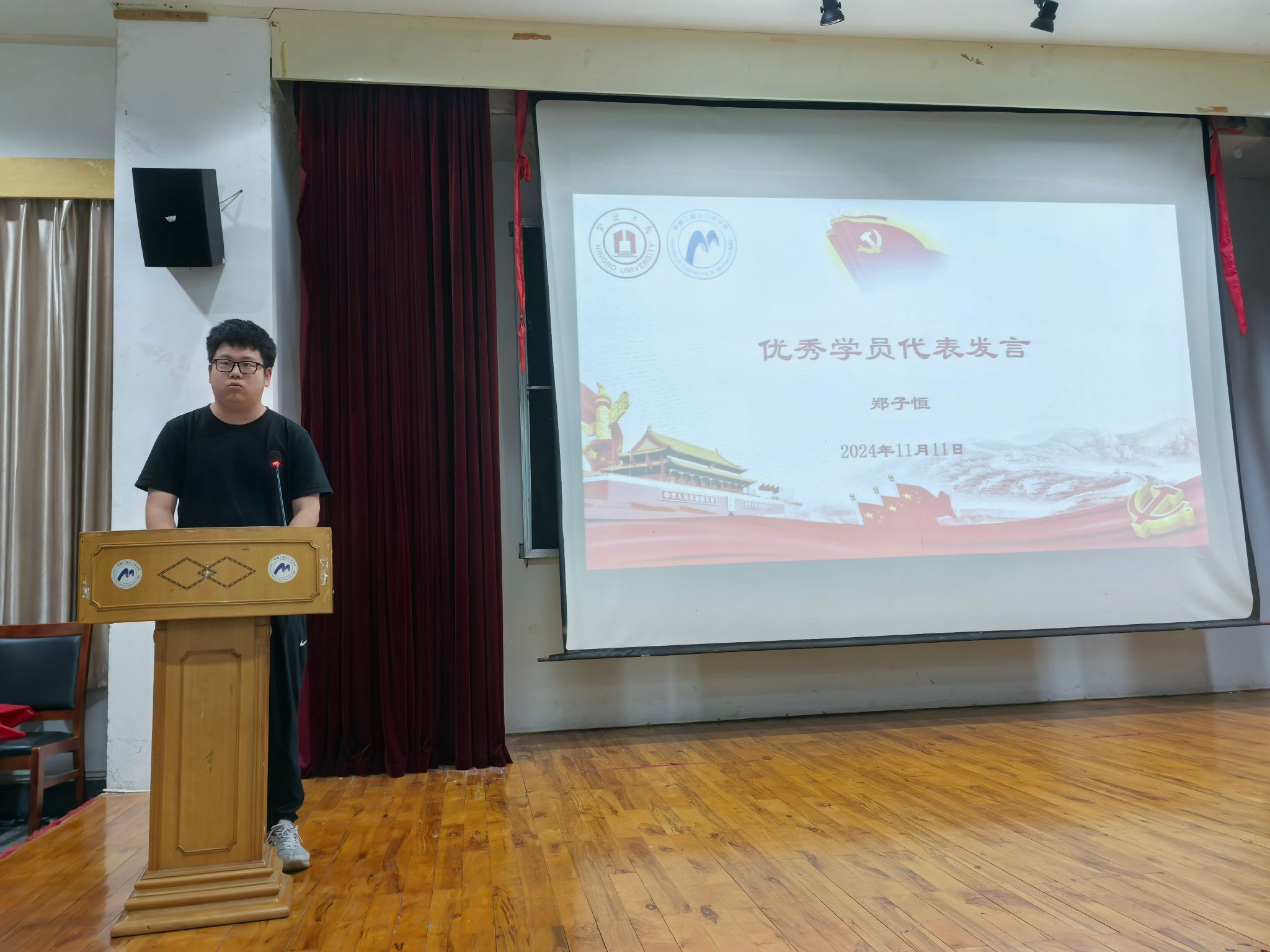 优秀学员代表郑子恒同学发表了感言。他代表全体学员表达了对学院和分党校精心组织的感激之情,并分享了个人在学习过程中的感悟与收获。他表示,通过这段时间的学习,不仅加深了对党的认识和理解,更坚定了成为一名合格共产党员的决心和信念。