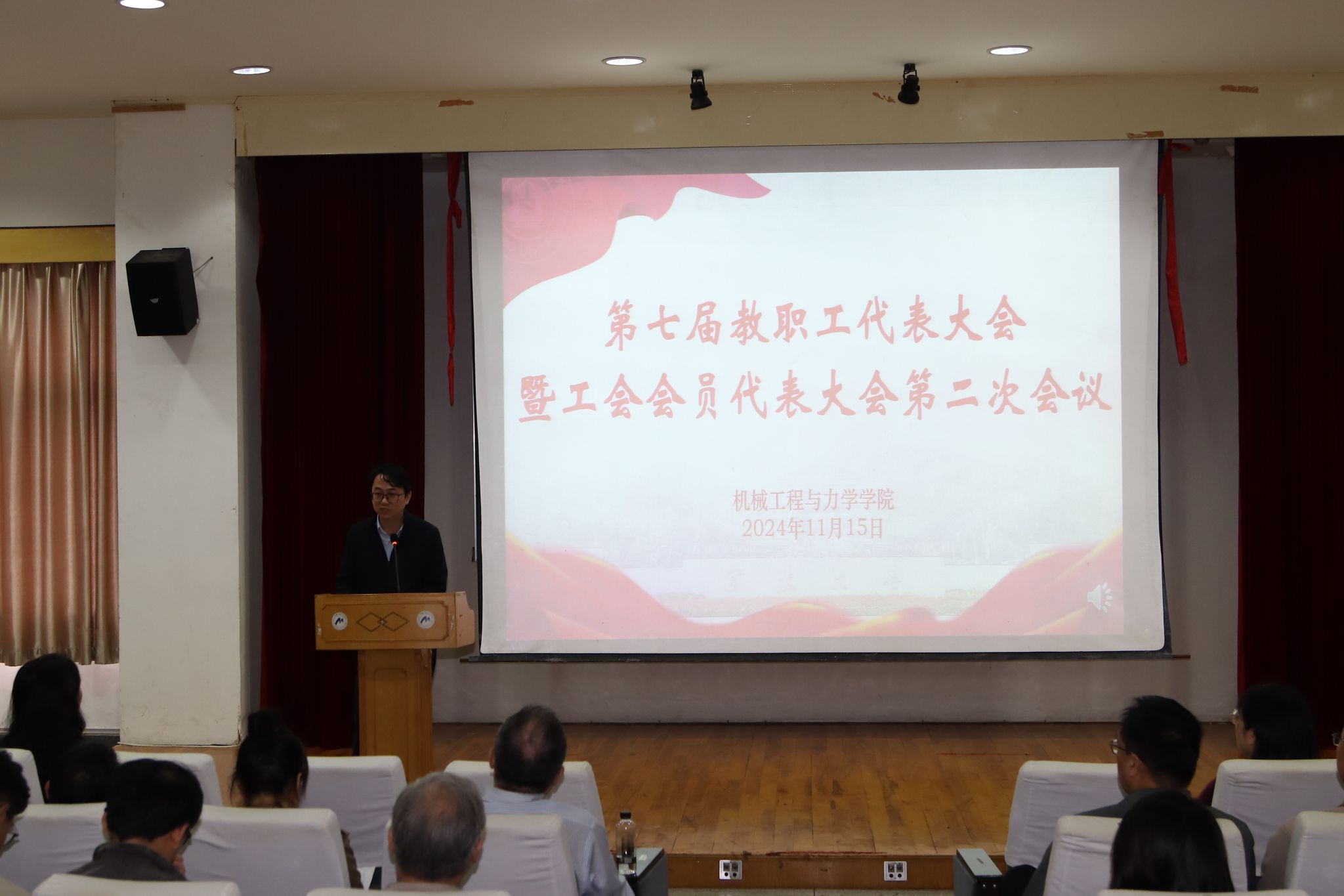 第七届教职工代表大会暨工会会员代表大会第二次会议在绣山工程楼3楼报告厅举行,会议由分工会主席沈妍伶主持。