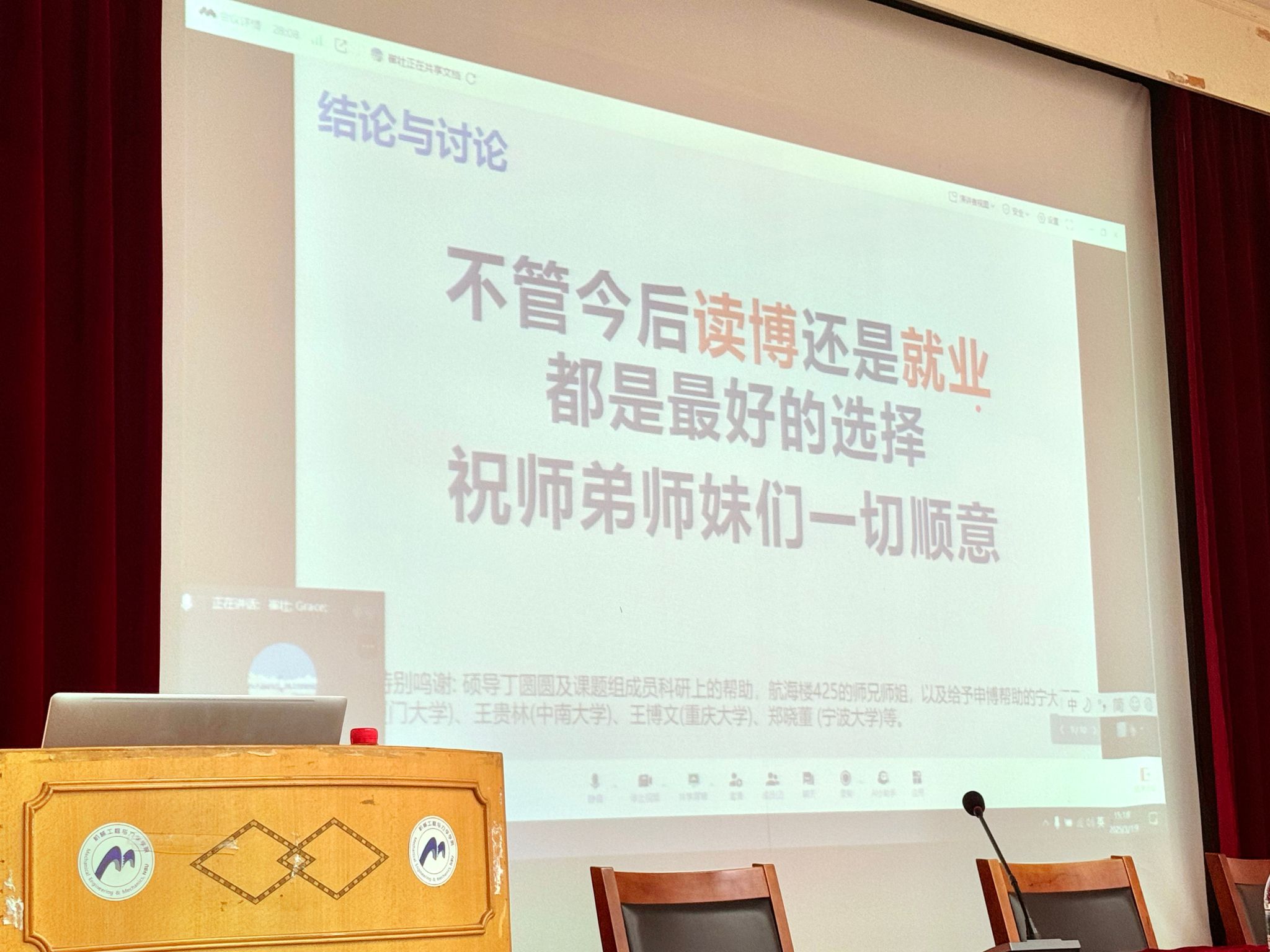 的连晨成学长,他从力学学科建设历程、学校的支持力度、读博动机和导师选择等方面做出风趣讲解。他鼓励想要出国交流的同学关注意大利都灵理工大学的合作项目,介绍了联合培养机制以及力学博士的国际资源对接。紧接着,他从自身经验出发,告诉大家“什么样的人适合读博士”、“如何选择合适的导师”和“如何判定导师对自身的帮助”,幽默通俗的讲解融合发自肺腑的经验之谈让在场的同学收获满满。