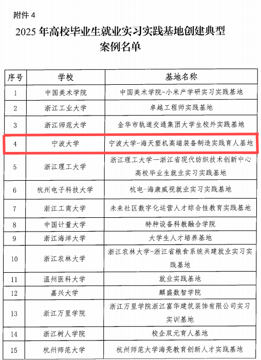 -海天塑机高端装备制造实践育人基地》获评“高校毕业生就业实习实践基地创建典型案例”(全省共51个,全校唯一)。