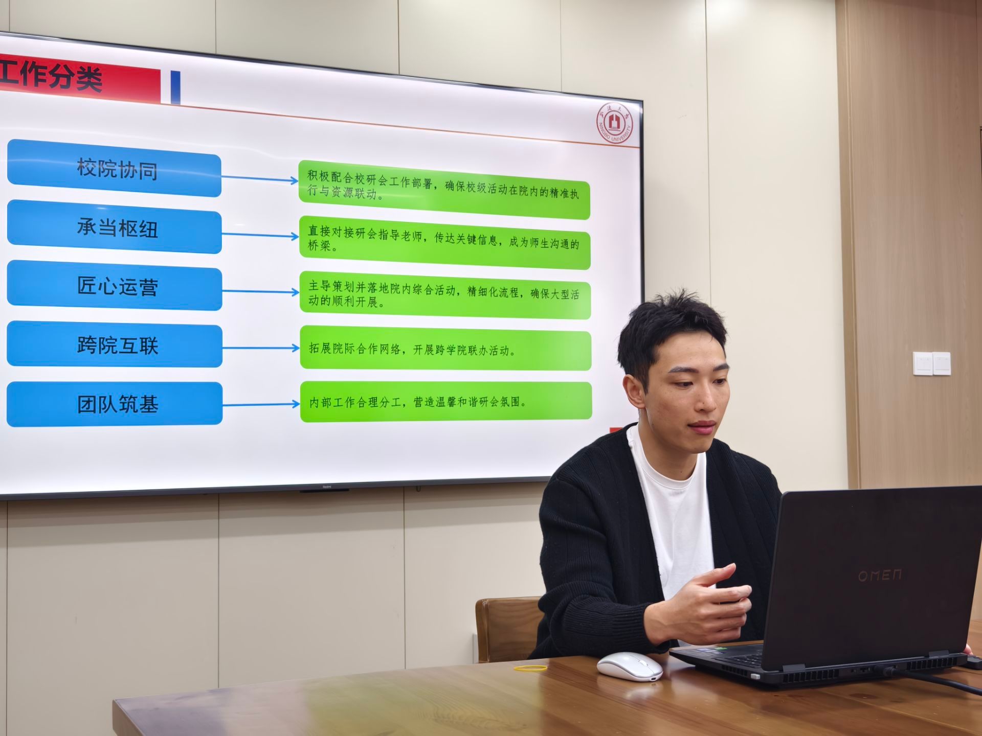 活动伊始,执行主席范思哲以宏观的视角梳理并总结研会过去一年的工作内容。他在全面复盘研会在服务研究生成长和助力学院发展中所扮演的角色,为后续各部门述职奠定了整体基调。紧随其后,各部门依次亮相,将过去一年的耕耘与收获娓娓道来。生活部聚焦“服务温度”,将宿舍安全排查、卫生检查与学生日常生活遇到的问题都列为工作重点,致力于营造舒适和谐的校园生活;文体部则是“活力担当”,无论是运动会的动员还是学院日常活动的开展,都能瞥见他们昂扬奋斗的身影;办公室用严谨的态度面对文件流传的规范操作、各种活动的资料整理,是他们为研会提供坚实后盾的信心;宣传部化身为学院的“小喇叭”,通过快门、文字与科技结合的方式,记录下研会的每一个重要瞬间;学术部则始终坚持着科研初心,公平公正地面对每一次评奖评优,并一丝不苟地完成每一次的资料整合。