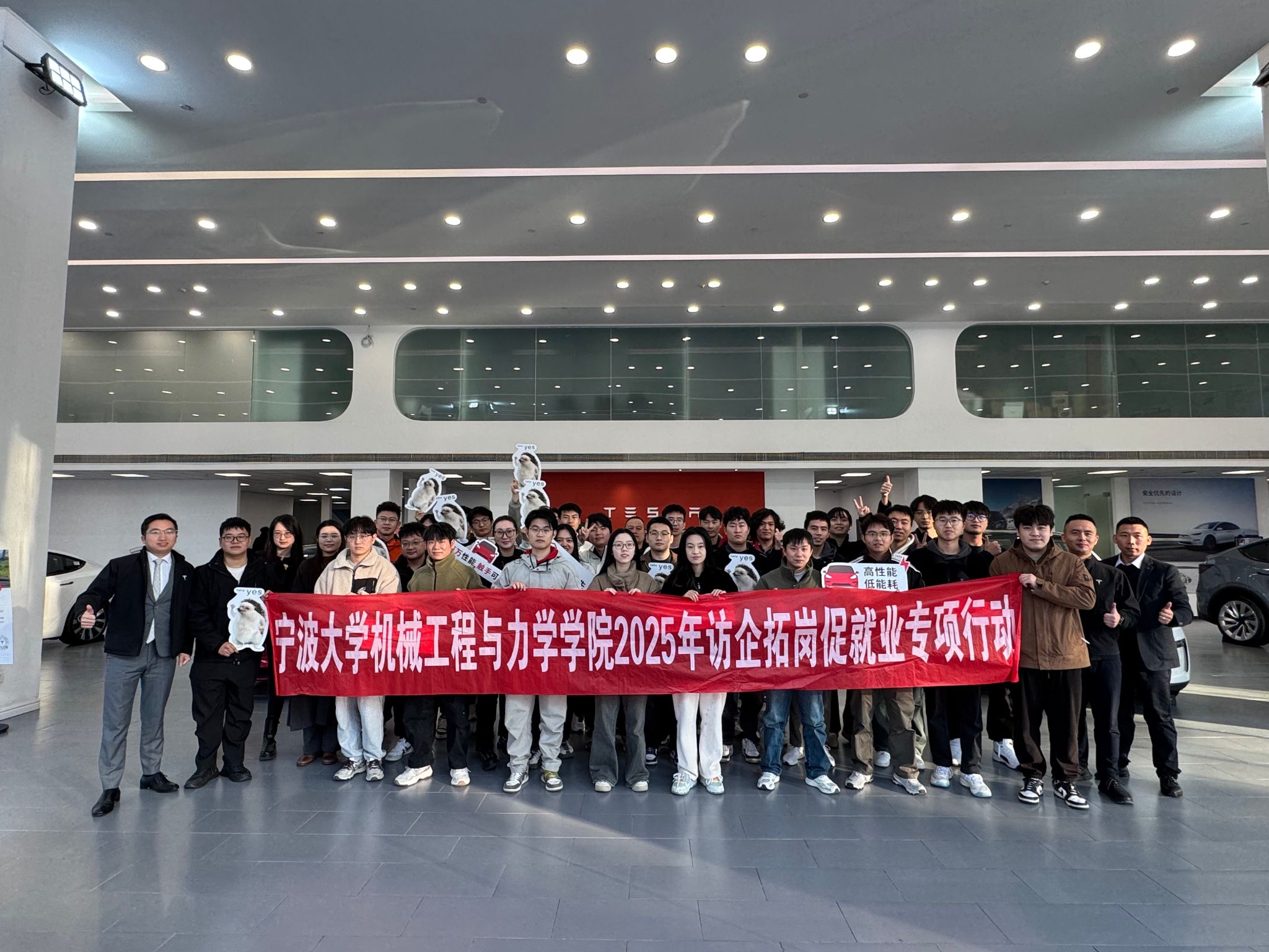 师生一行30余人受邀前往宁波鄞州特斯拉中心(以下简称“中心”)开展访企拓岗促就业专项行动暨“特别见面会”校企交流活动。中心店长钱仕鹤等企业负责人热情接待了学院师生。