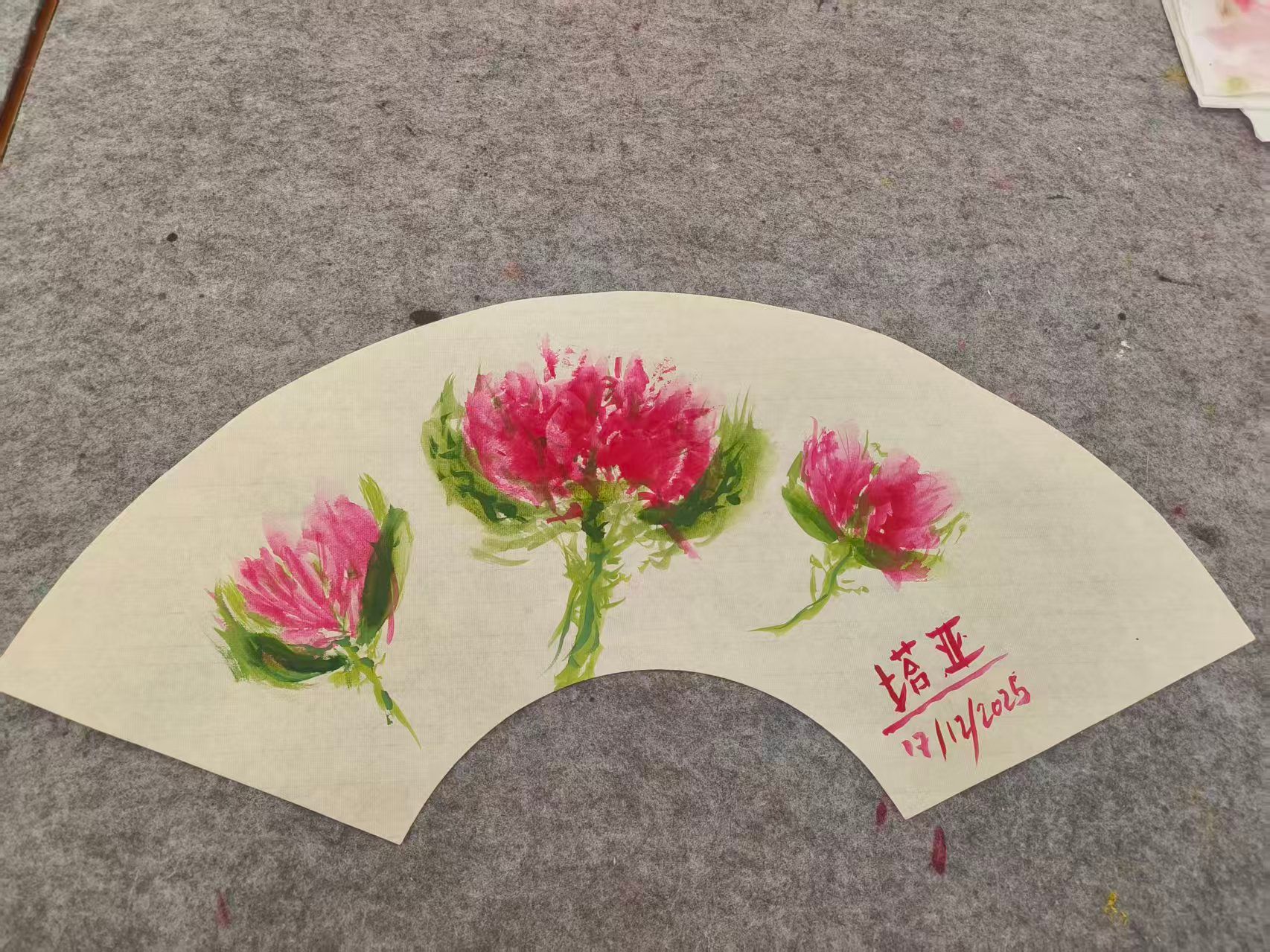 初探水墨画,笔触轻柔绘牡丹。活动现场,姜老师全程以英语细致讲授国画核心技法,从调墨控水的分寸拿捏,到牡丹花瓣的层叠晕染、枝叶的疏密勾勒,逐笔示范、手把手指导,耐心纠正每一位学子的落笔角度与运笔力度。浓墨衬风骨,淡彩显雅致,随着笔墨在宣纸上缓缓铺展,一朵朵雍容华贵的牡丹悄然绽放,绿叶扶疏间尽显生机灵动。学子们凝神落笔、悉心揣摩,每一笔都是对传统艺术的深度探寻,每一幅习作都是水墨与心意的交融,在挥毫泼墨中沉浸式感受东方美学的独特韵味,完成一场心灵与传统艺术的深度对话。